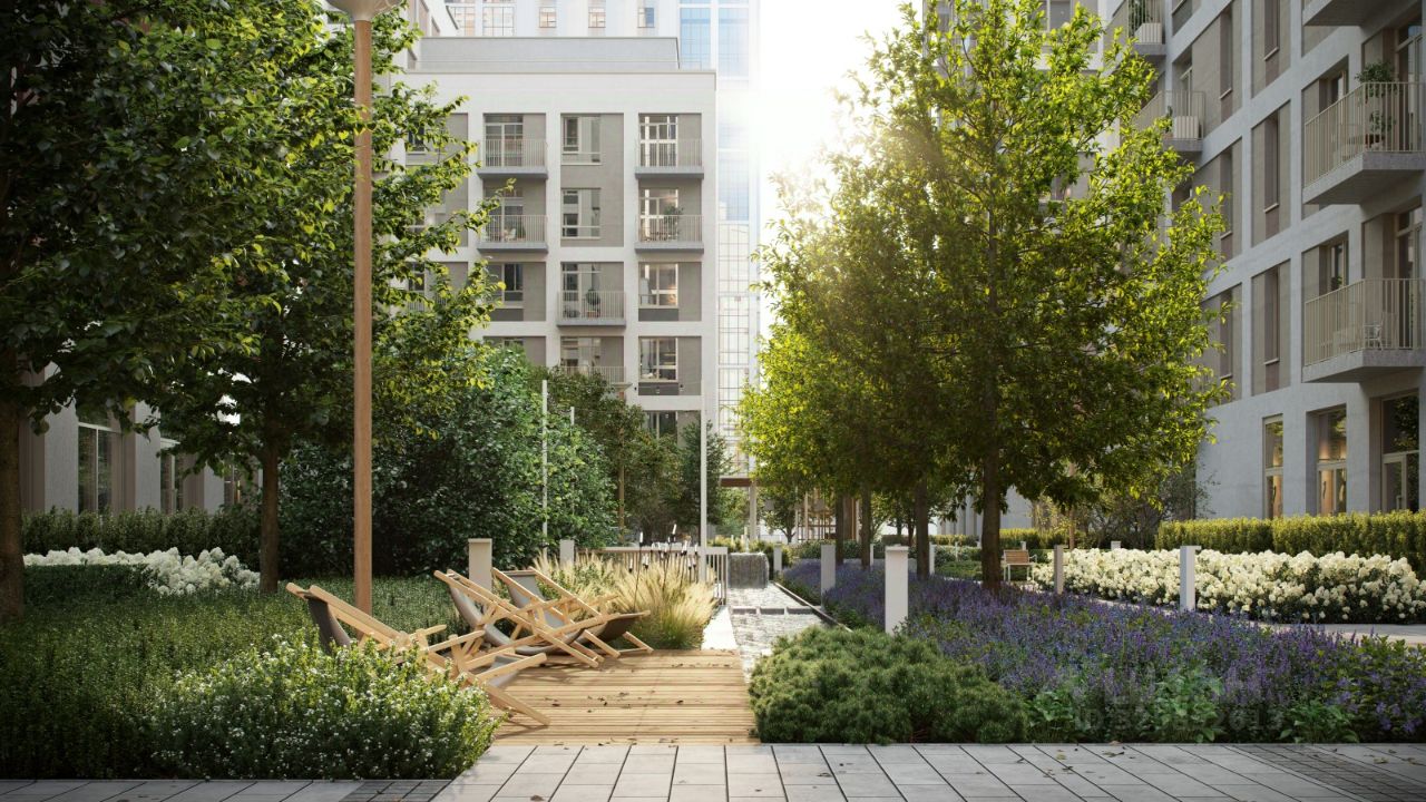Благоустройство жилого комплекса это синтез искусства и природы. Поющие музыкальные инсталляции и поэтический променад. Оркестр растений: сирень, гортензии и яблони, чья цветущая палитра сменяется в течение года.