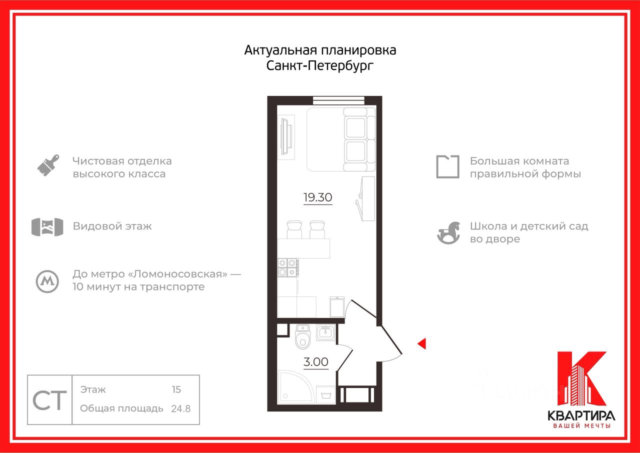 Планировка: Функциональная студия с продуманным зонированием — просторная жилая зона сочетает спальню, гостиную и кухню, отдельное рабочее место для комфортной работы или учебы. Нет лишних коридоров — все пространство используется рационально, а большие окна обеспечивают в два раза больше естественного света. Идеально для одного человека или молодой пары, а также под сдачу в аренду.