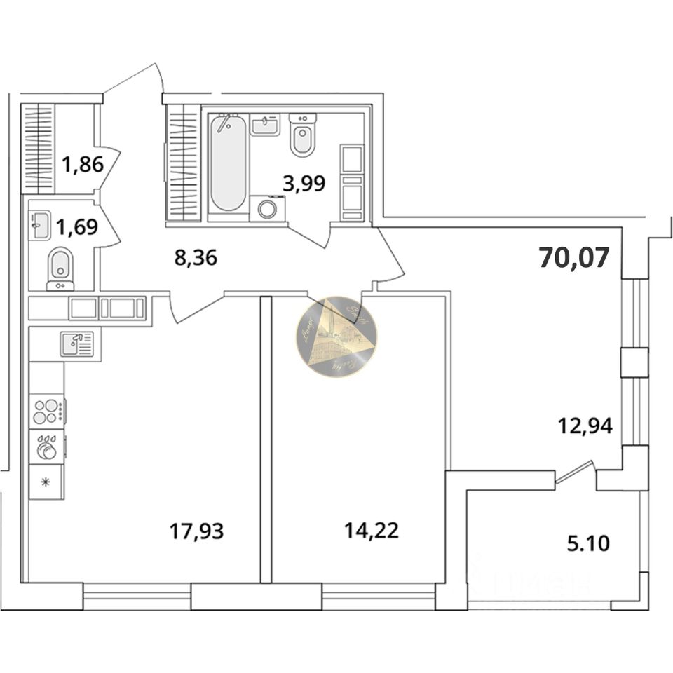 О квартире: - Квартира находится на 15 этаже 18-этажного дома - Общая площадь квартиры 70.07 м2 - Уютная спальня 12.94 м2 - Просторная детская 14.22 м2 - Кухня-гостиная 17.93 м2 - Раздельный санузел 3.99 + 1.69 м2 - Гардеробная 1.86 м2 - Застекленная лоджия 5.10 м2
