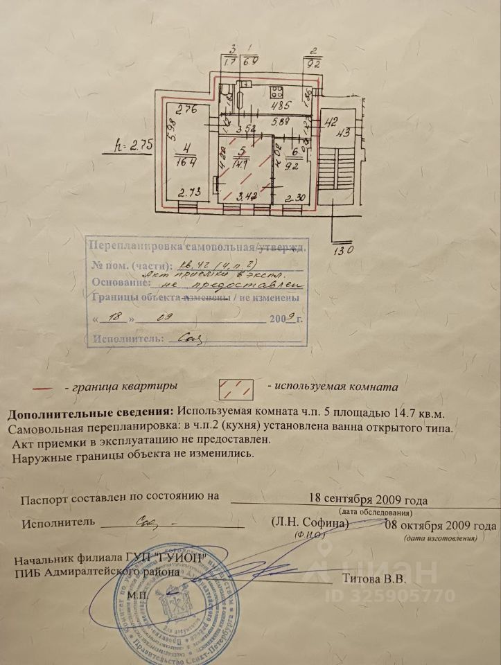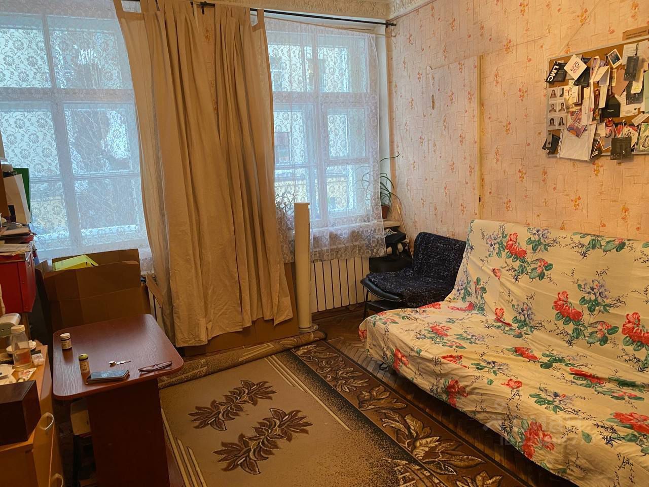 Продаётся комната 14.7 в 3 к. кв. , общей площадью 58.1, кухня 9.2, коридор 6.9, туалет 1.7 м, ванна на кухне, закрывается шторкой, акта на перепланировку нет. Высота потолков 2.75. Год постройки 1847, капремонт 1958. Толстые кирпичные стены, перекрытия железобетонные. Комната почти квадратная, с двумя окнами деревянными двойными. Окна в большой зеленый двор, восток, первый двор, закрывается на ворота. Вход со двора, сделан ремонт фасада дома. Квартира находится над цокольным этажом, на втором этаже 4х этажного дома. В квартире паркет. У окна справа в стену углублён небольшой шкаф, закрытый дверью. Один собственник, собственность с 2010 года, не зарегистрирован. Проживает три человека, соседи хорошие. Получен от собственника другой комнаты отказ, третья комната не приватизирована.