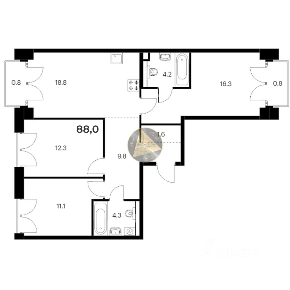 О квартире: - Квартира находится на 7 этаже 9-этажного дома - Общая площадь квартиры 88.0 м2 - Мастер-спальня 10.9 м2 с отдельным санузлом 4.2 м2 - Детские комнаты 12.3 и 11.1 м2 - Просторная кухня-гостиная 18.8 м2 - Совмещённый санузел 4.3 м2 - Гардеробная 1.6 м2 - 2 балкона 0.8 и 0.8 м2