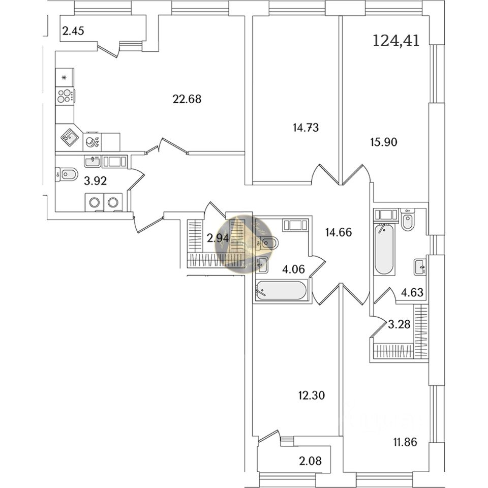 О квартире: - Квартира находится на 15 этаже 22-этажного дома - Общая площадь квартиры 124.41 м2 - Мастер-спальня 11.86 м2 с отдельным санузлом 4.63 м2 и гардеробной 3.28 м2 - Детские комнаты 14.73 и 15.90 м2 - Гостевая спальня 12.30 м2 - Просторная кухня-гостиная 22.68 м2 - 2 совмещённых санузла 3.92 и 4.06 м2 - Гардеробная 2.94 м2 - 2 лоджии 2.08 и 2.