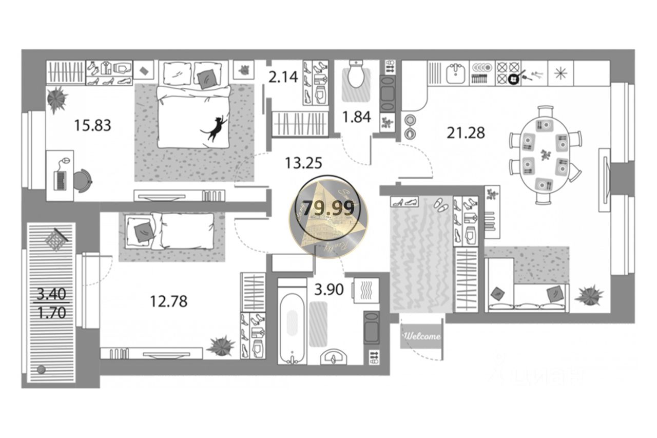 О квартире: - Квартира находится на 5 этаже 8-этажного дома - Общая площадь квартиры 79.99 м2 - Уютная спальня 15.83 м2 с гардеробной 2.14 м2 - Детская комната 12.78 м2 - Просторная кухня-гостиная 21.28 м2 - Раздельный санузел 3.90 + 1.84 м2 - Лоджия 3.40 м2