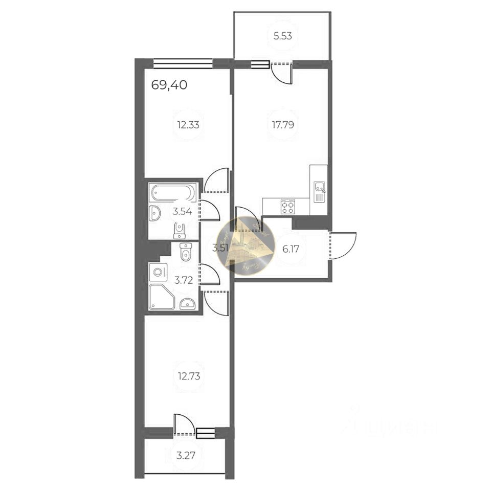 О квартире: - Квартира находится на 4 этаже 7-этажного дома - Общая площадь квартиры 69.40 м2 - Светлая спальня 12.73 м2 - Уютная детская 12.33 м2 - Просторная кухня-гостиная 17.79 м2 - 2 совмещённых санузла 3.72 и 3.54 м2 - 2 лоджии 5.53 и 3.27 м2