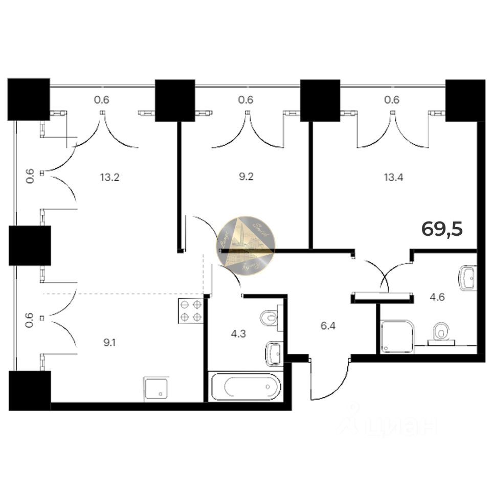 О квартире: - Квартира находится на 8 этаже 9-этажного дома - Общая площадь квартиры 69.5 м2 - Мастер-спальня 13.4 м2 с отдельным санузлом 4.6 м2 - Уютная детская 9.2 м2 - Просторная кухня-гостиная 22.3 м2 - Совмещённый санузел 4.3 м2 - 5 балконов по 0.6 м2