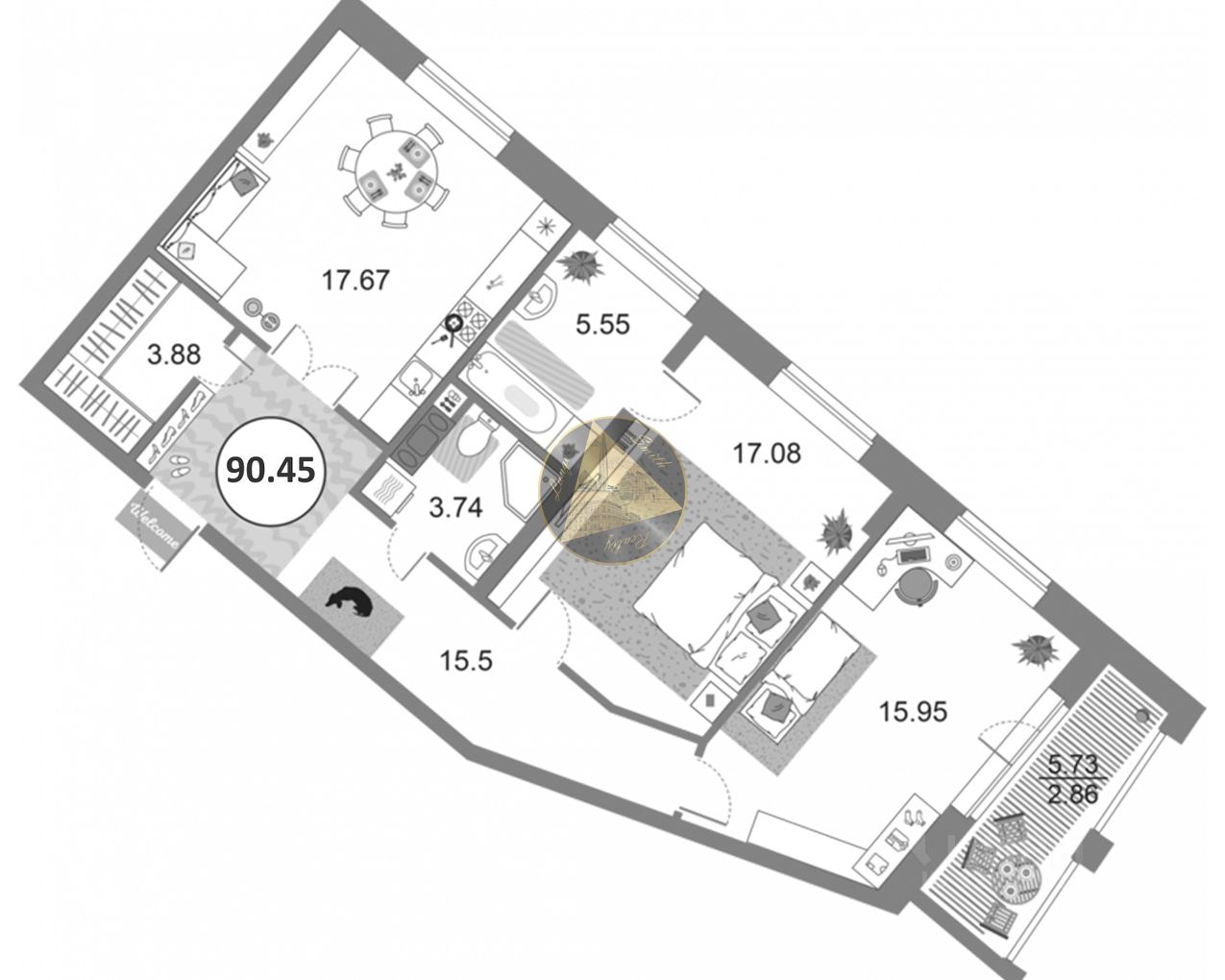 О квартире: - Квартира находится на 5 этаже 12-этажного дома - Общая площадь квартиры 90.45 м2 - Светлая спальня 17.08 м2 с отдельным санузлом 5.55 м2 - Детская комната 15.95 м2 - Просторная кухня 17.67 м2 - Совмещённый санузел 3.74 м2 - Гардеробная 3.88 м2 - Лоджия 5.73 м2