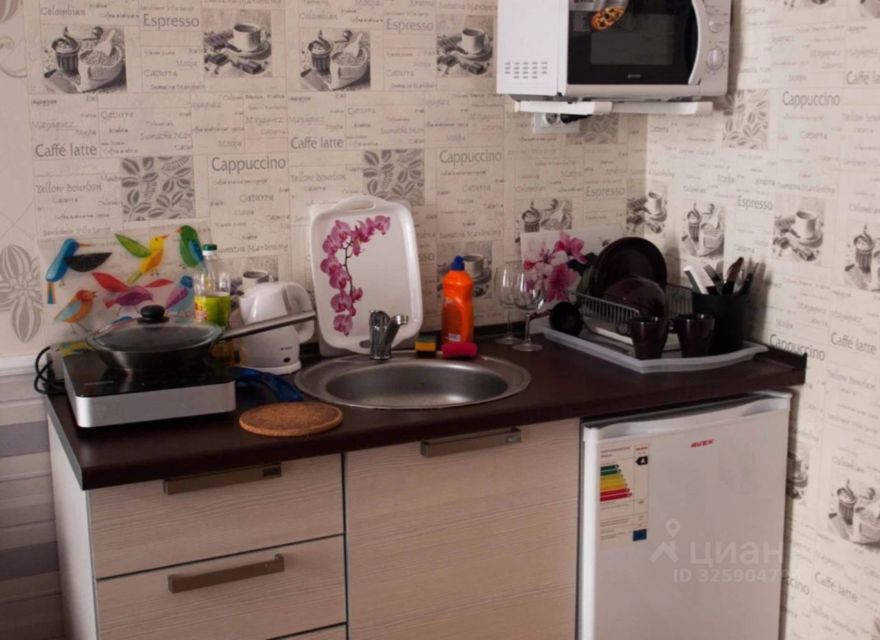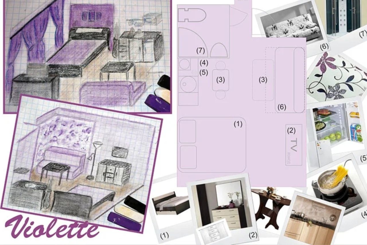 Уютная студия в фиолетовых тонах, оформленная на тему Орхидеи. Всё для комфортного отдыха: двуспальная кровать с новым матрасом, дауспальный диван, вместительный комод (плечики, полки, ящики). В кухонной зоне предусмотрено всё для удобного приготовления вкусных завтраков и ужинов: индукционная плита мгновенного разогрева, СВЧ, полноценная мойка, небольшой холодильник с морозилкой (вмещает кастрюли и сковородки). Санузел совмещенный, душевая кабина. Стиральная машина, сушилка, утюг и гладильная доска.