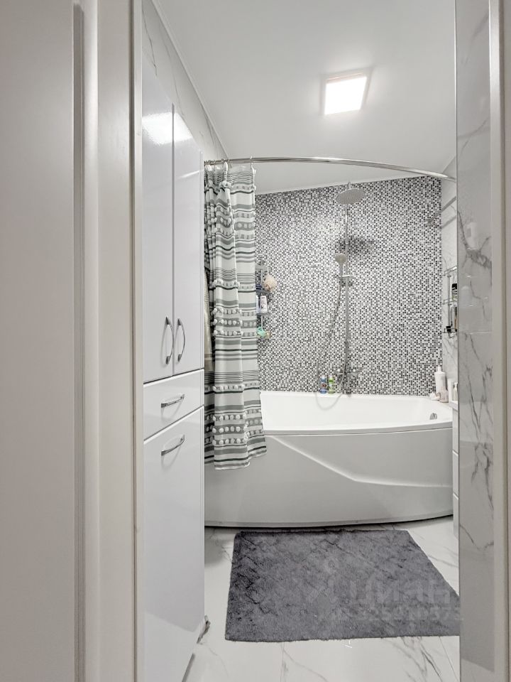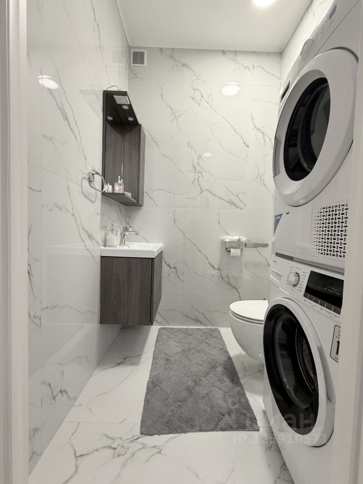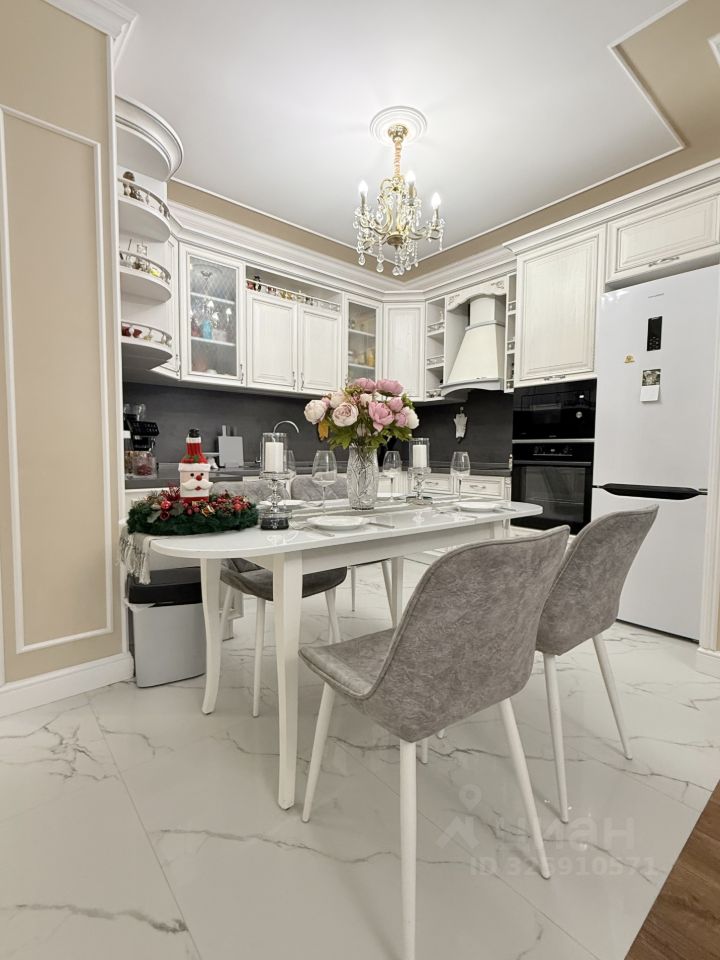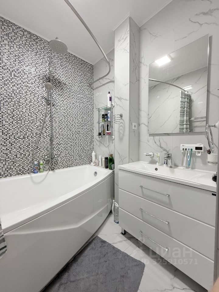 Кухня оборудована современной техникой, включая холодильник и посудомоечную машину. В квартире установлены шкафы и мебель, создающие уютную атмосферу. Ванная комната выполнена в светлых тонах с раздельным санузлом.