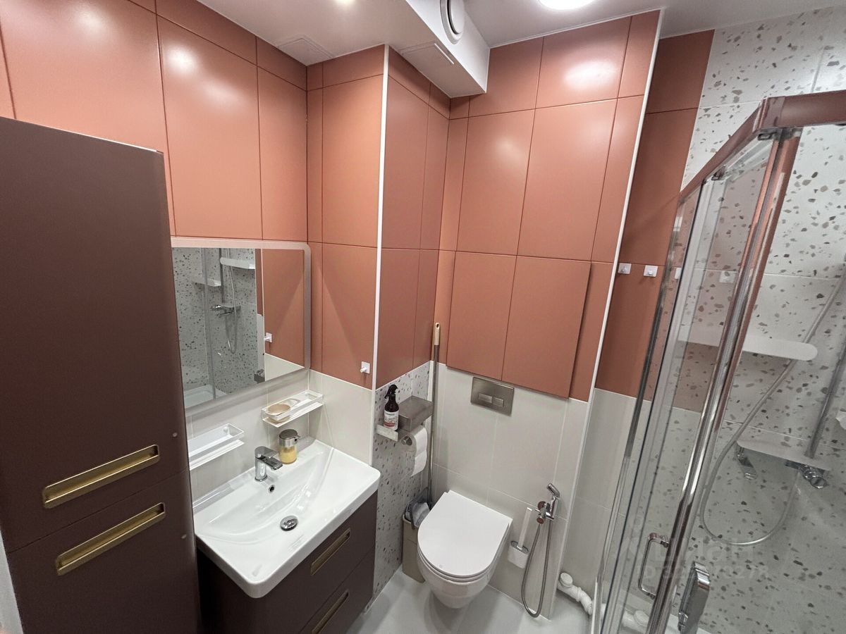 Совмещенный санузел, в котором есть все для комфорта. Качественная душевая кабина, много места для хранения, раковина, зеркало с подсветкой, гигиенический душ.