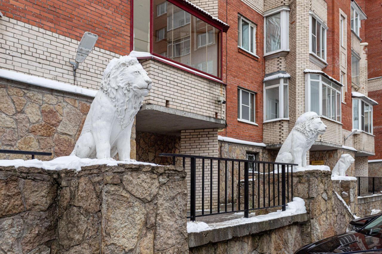 Парадная чистая, красиво оформлена. Статуи львов при входе.