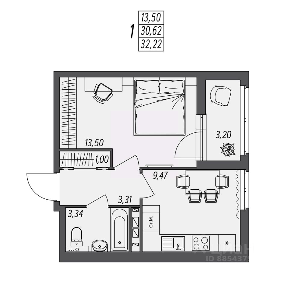 Общая площадь32,22 м2