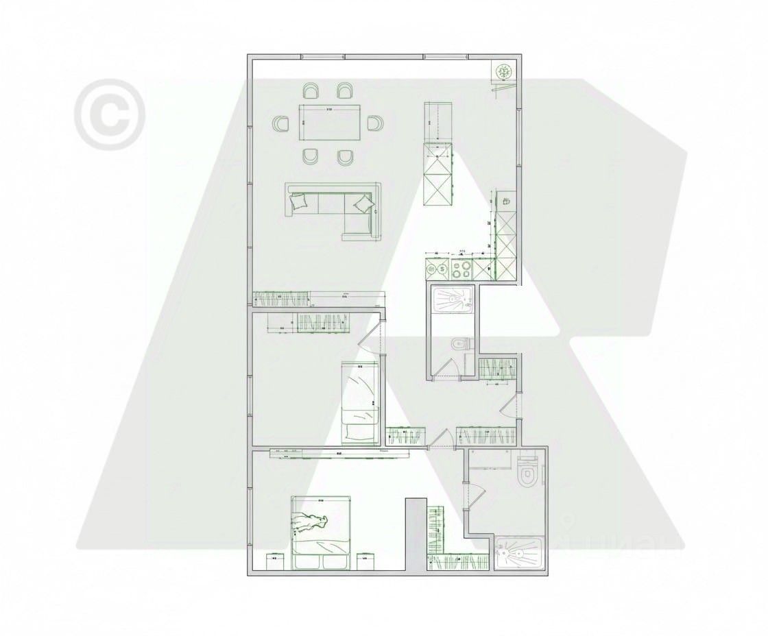 Планировочное решение: - Светлая кухня-гостиная с обеденной зоной. - Основная спальня с гардеробной и санузлом (установлена душевая кабина). - Детская/гостевая спальня. - Гостевой санузел, оборудованный душевой кабиной. - Зона холла с многочисленными системами хранения.