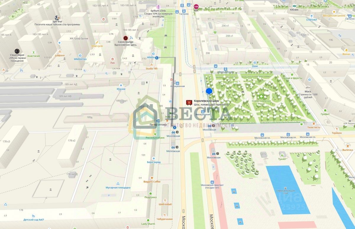 Помещение удобно располагается на пешем маршруте от входа в метро Московская. От входа в метро 250 м. В пешей доступности находятся магазины, жилые комплексы и дома, офисы, парки , скверы и т. д.