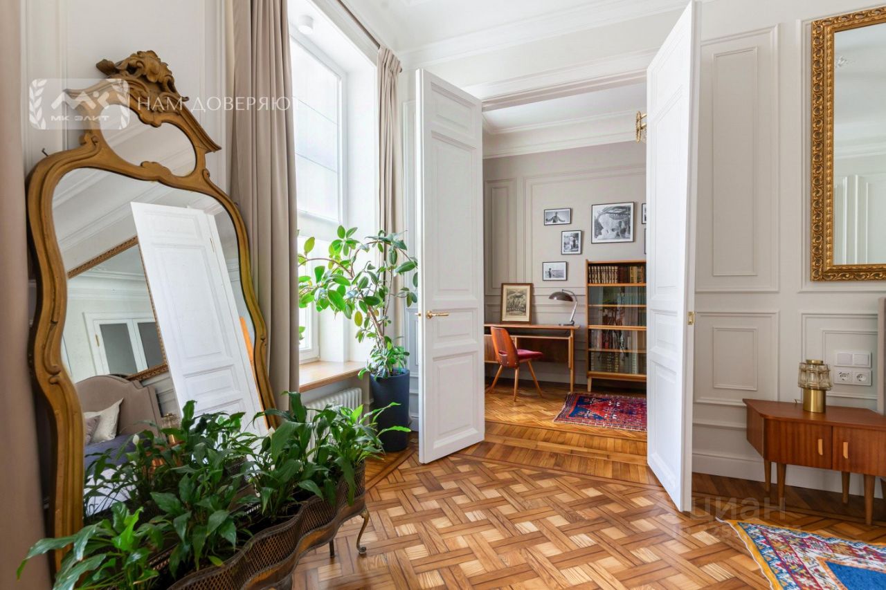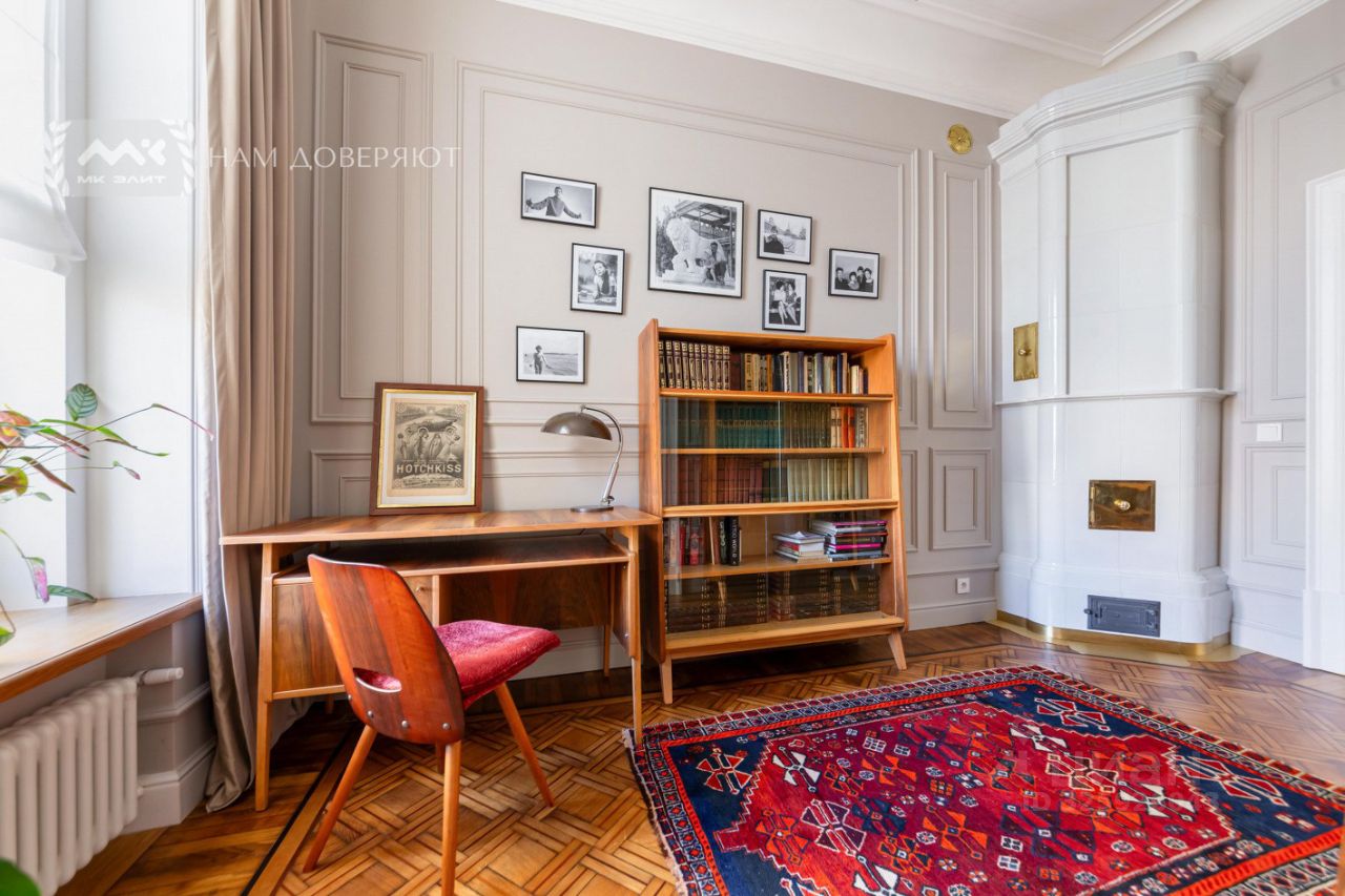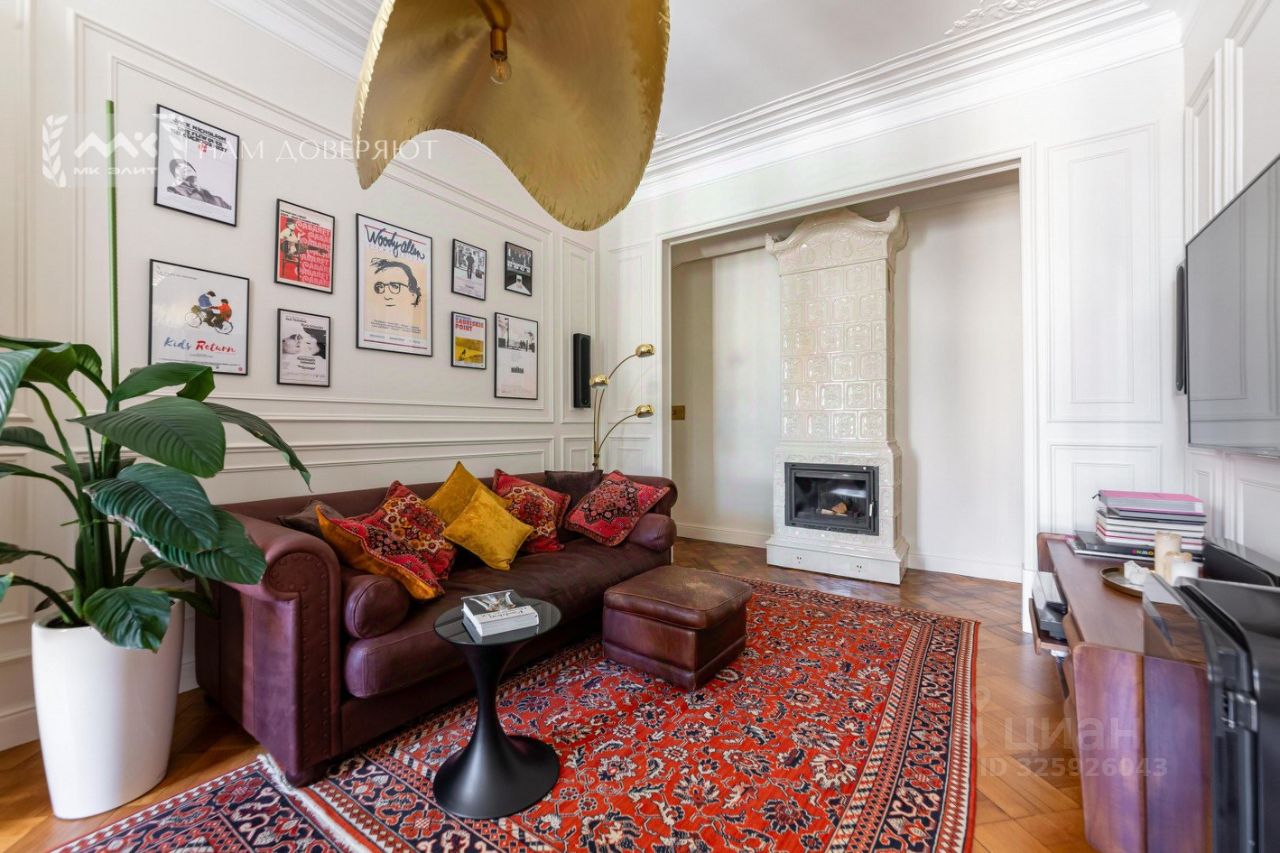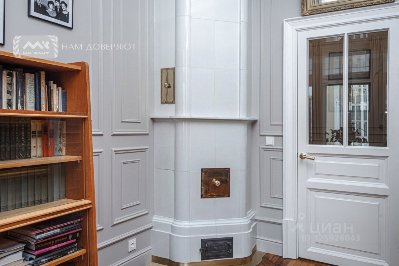 Эта квартира — живая историческая шкатулка. Ее стены помнят эпоху, что длилась с 1910-х по 1980-е годы. Печи, изысканная лепнина, массивные двери, дубовый паркет — всё это чудом сохранилось до наших дней.