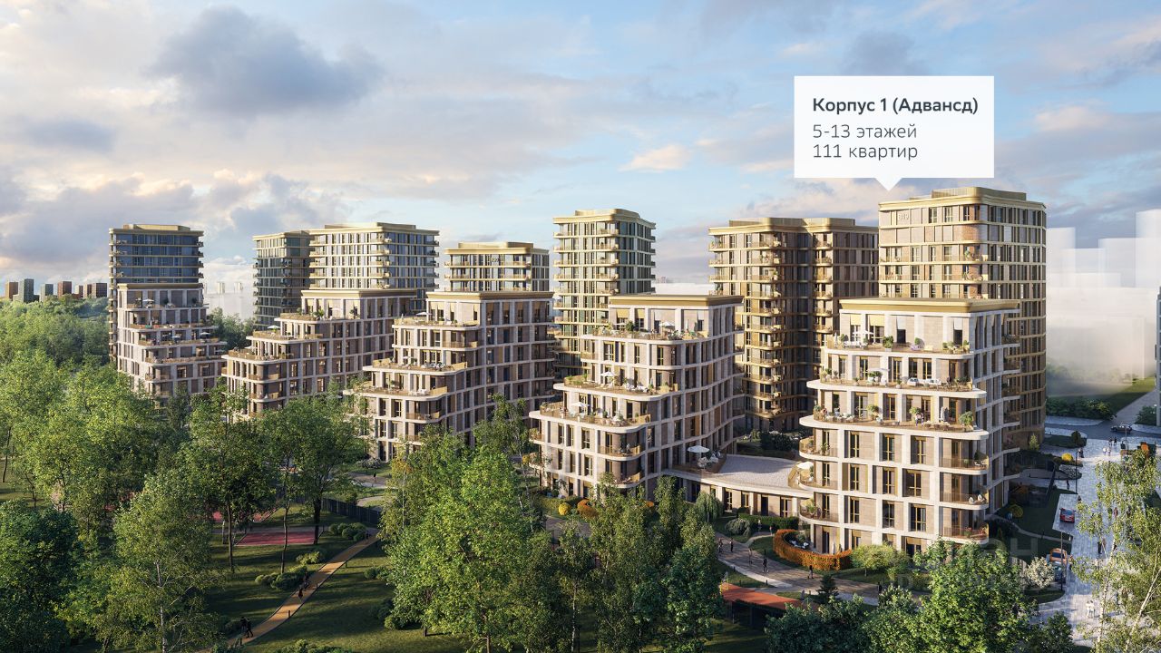 Отделка фасадов корпуса класса Адвансд выполнена из природного камня, глазурованной плитки и алюминия. Дом возводится по технологии монолитного строительства. В квартире проведены работы по улучшению шумоизоляции, установлены двухкамерные стеклопакеты с низкоэмиссионными стёклами, минимизирующими теплопотери. Высота окон — от 3 до 3,25 м.