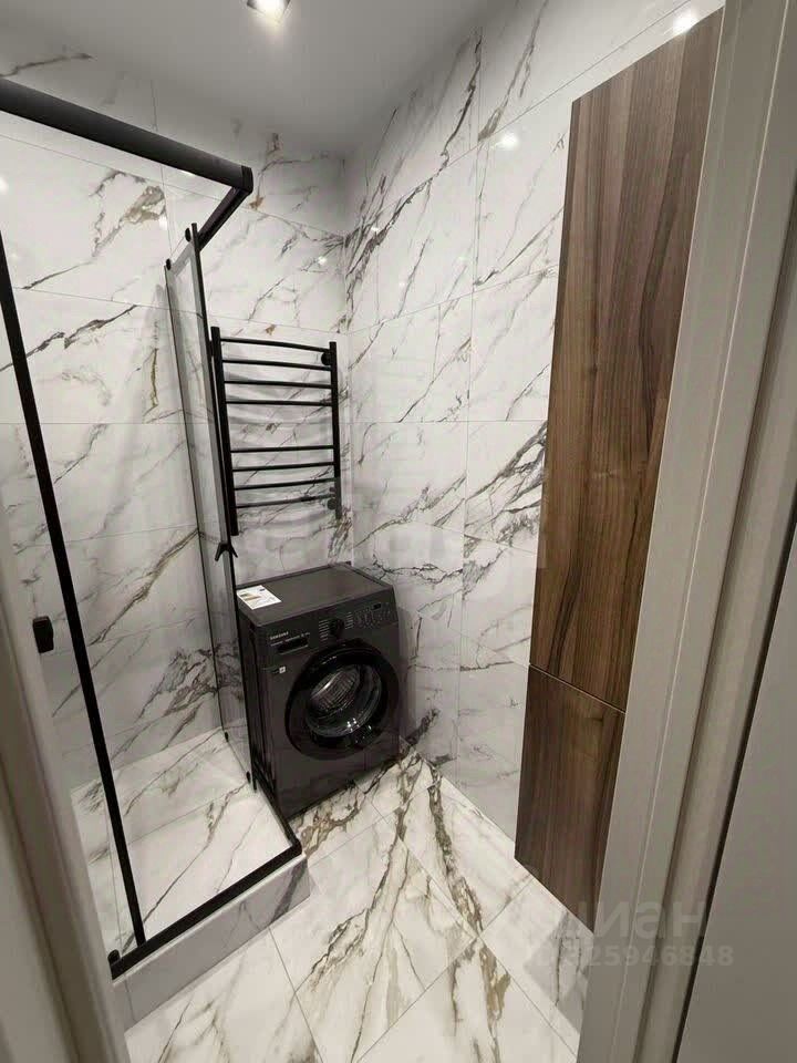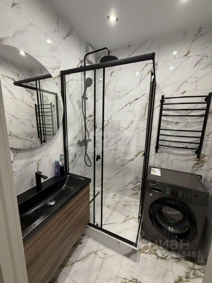 Санузел: • Раздельный, с душевой кабиной, пеналом для хранения вещей, полотенцесушителем, зеркалом с подсветкой и раковиной с тумбой. • Стиральная машина Samsung и подключенный проточный немецкий водонагреватель. • Вся сантехника выполнена в стильном черном цвете от Am.Pm.
