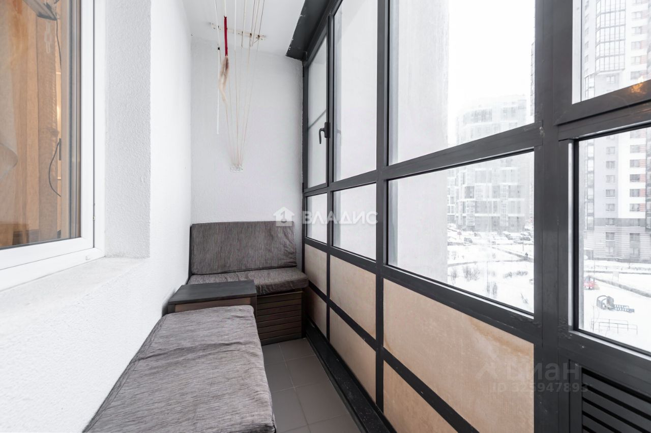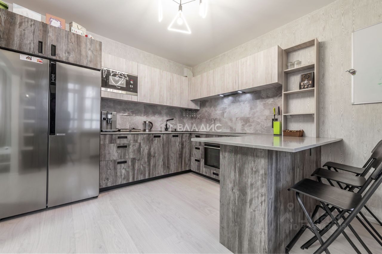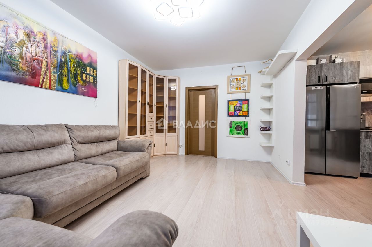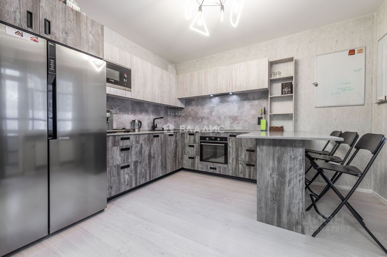Кухня объединена с гостиной, что создаёт удобное и функциональное пространство для жизни и приёма гостей. На кухне установлен кухонный гарнитур и двухдверный холодильник. Из кухни есть выход на застеклённую лоджию, где оборудована комфортная зона для отдыха.