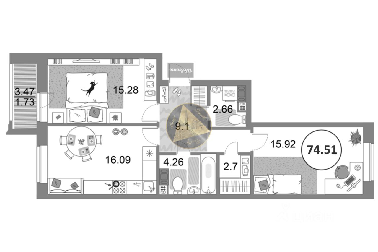 О квартире: - Квартира находится на 8 этаже 12-этажного дома - Общая площадь квартиры 74.51 м2 - Уютная спальня 15.28 м2 - Детская комната 15.92 м2 - Просторная кухня-гостиная 16.09 м2 - Раздельный санузел 4.26 + 2.66 м2 - Гардеробная 2.7 м2 - Лоджия 3.47 м2