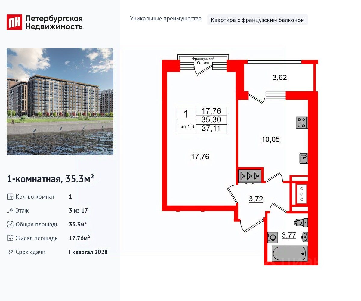 Уникальная планировка, кухня 10.05 м², вместительная прихожая 3.72 м². Общая площадь квартиры - 35.3 м², жилая 17.76 м², высота потолка 2.77 м.