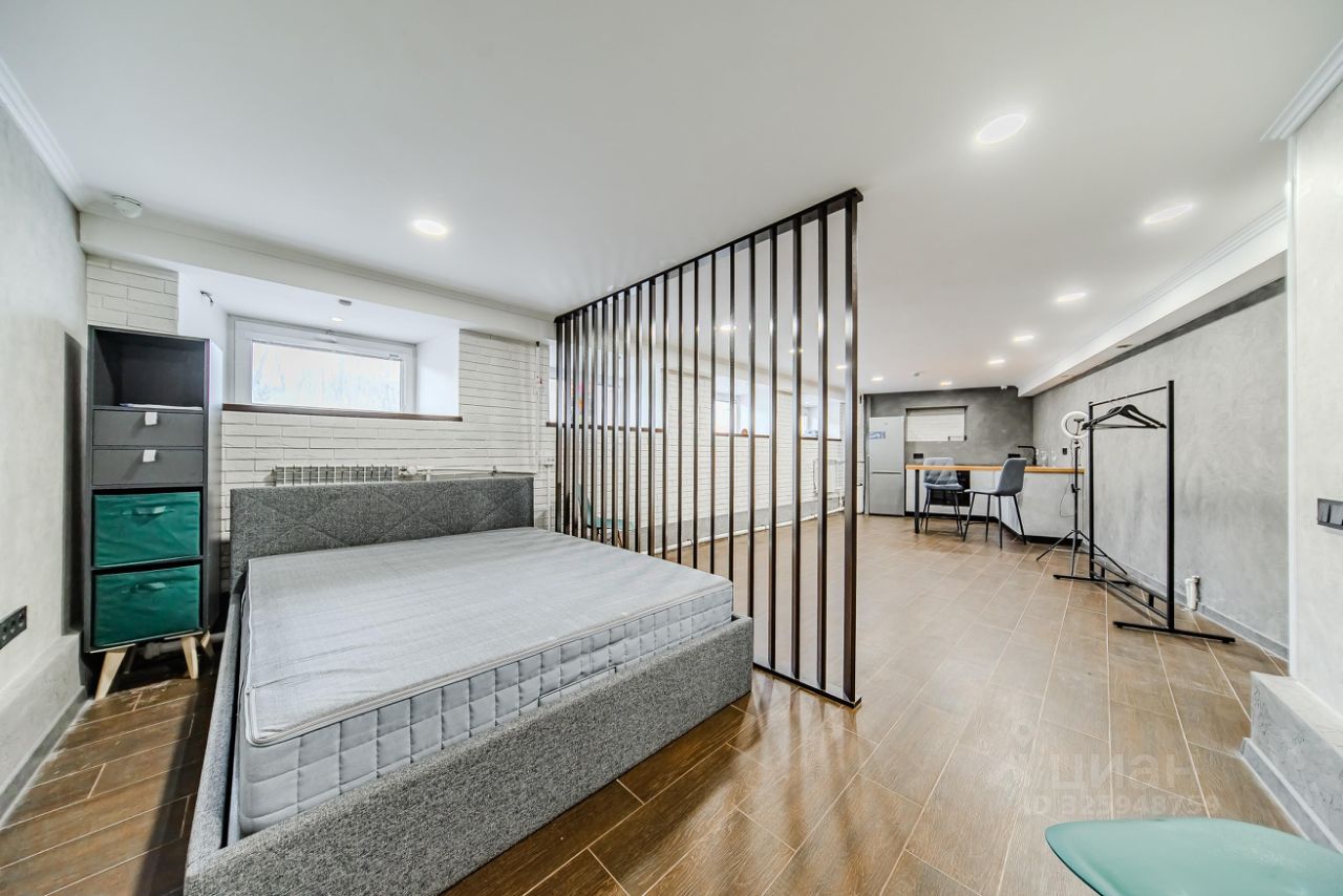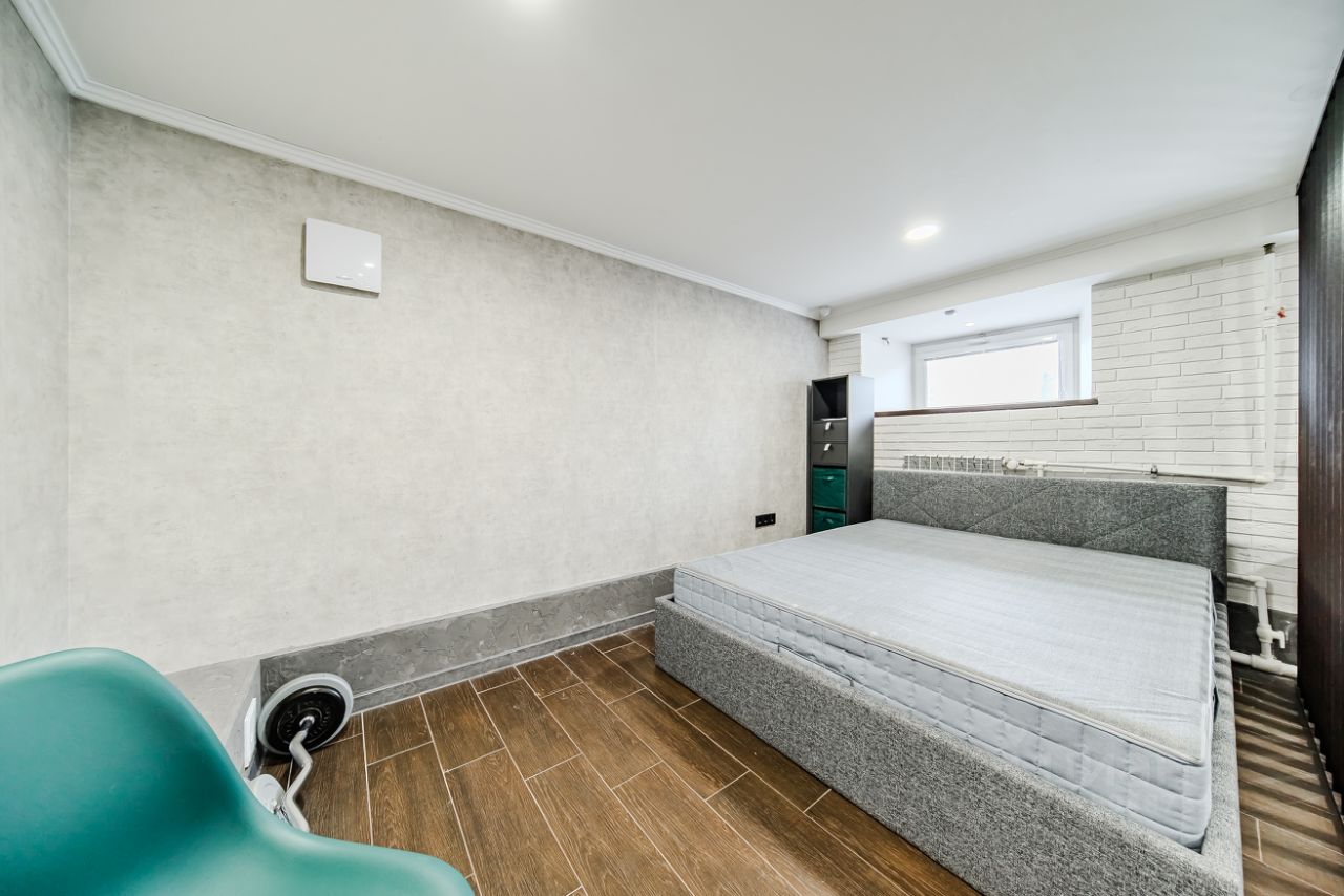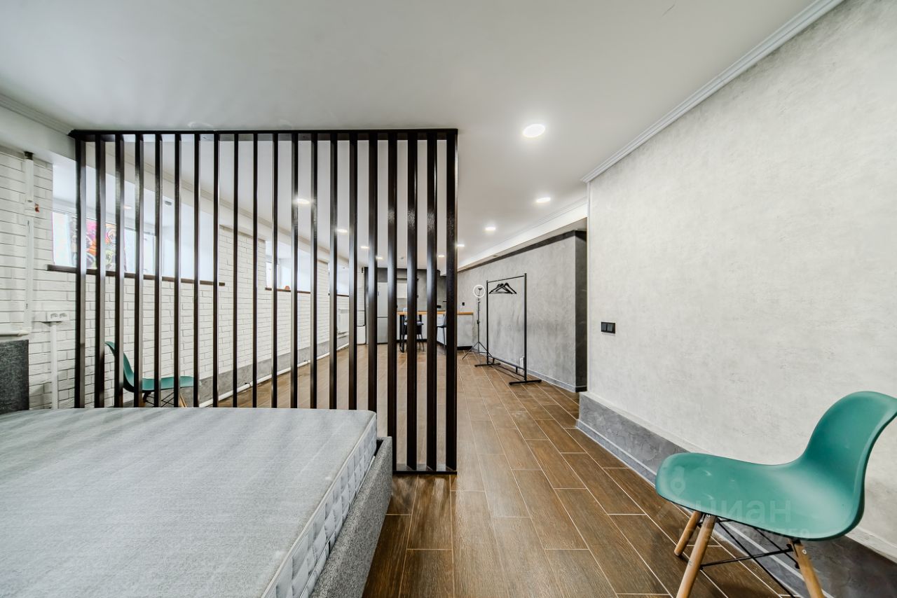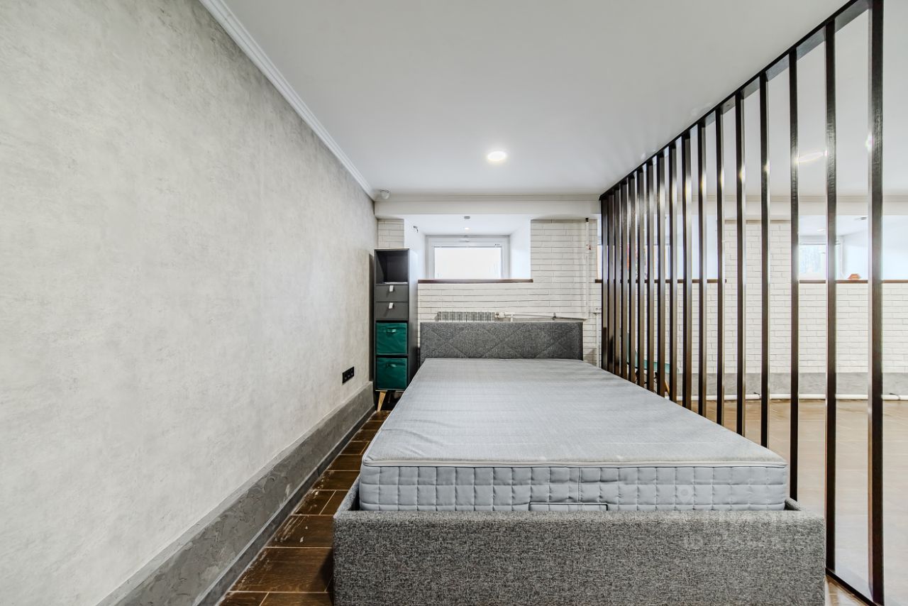 Удобное зонирование спальной зоны от кухонной (при этом между этими зонами довольно много свободного пространства, где вы можете заниматься спортом, творить или работать)
