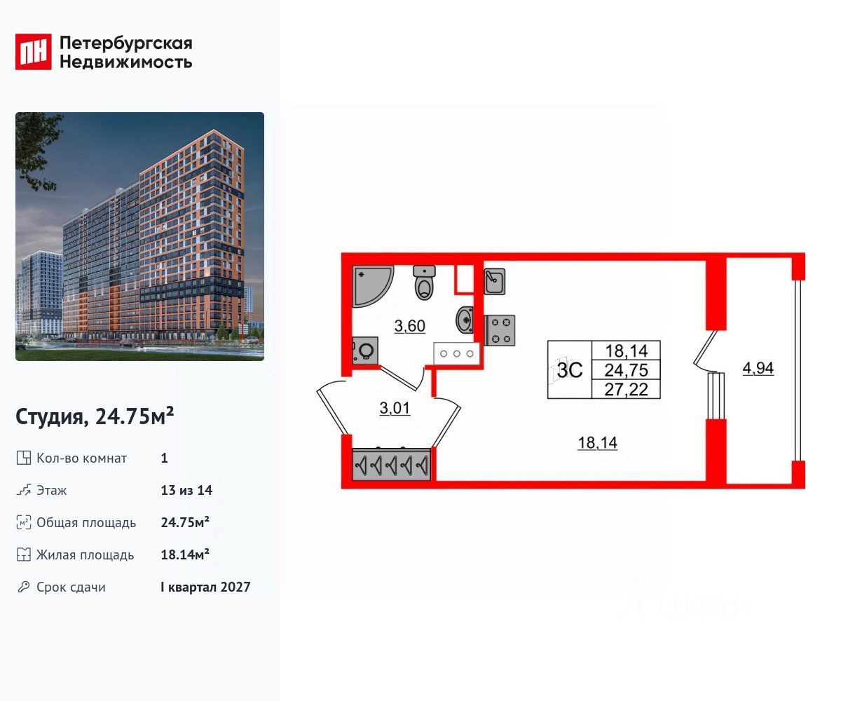 Удобная, классическая, функциональная европланировка, вместительная прихожая 3.01 м². Общая площадь студии - 24.75 м², жилая 18.14 м², высота потолка 2.75 м.