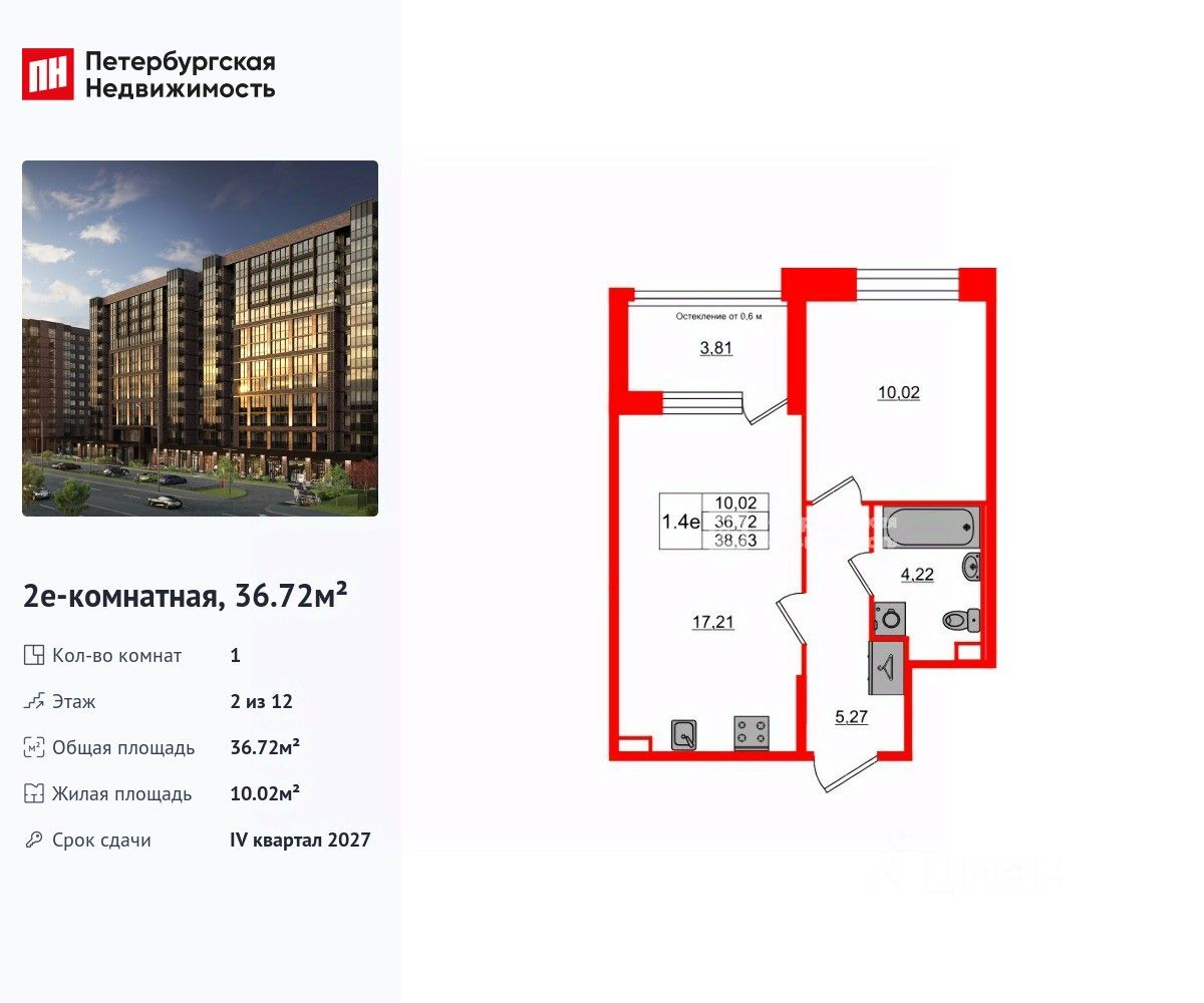 Удобная, классическая, функциональная европланировка, большая кухня-гостиная 17.21 м², просторная прихожая 5.27 м². Общая площадь квартиры - 36.72 м², жилая 10.02 м², высота потолка 2.75 м.