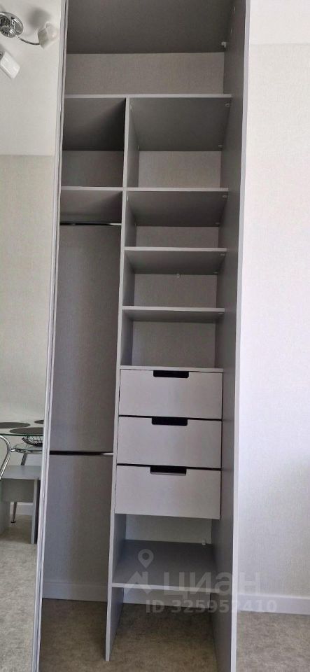 Полная комплектация Мебель: • Диван 180200 см с бельевым ящиком • Гардеробная • Стеллаж с ящиками для хранения • Съёмная сушилка для белья • Обеденный стол и стулья • Зеркало с подсветкой