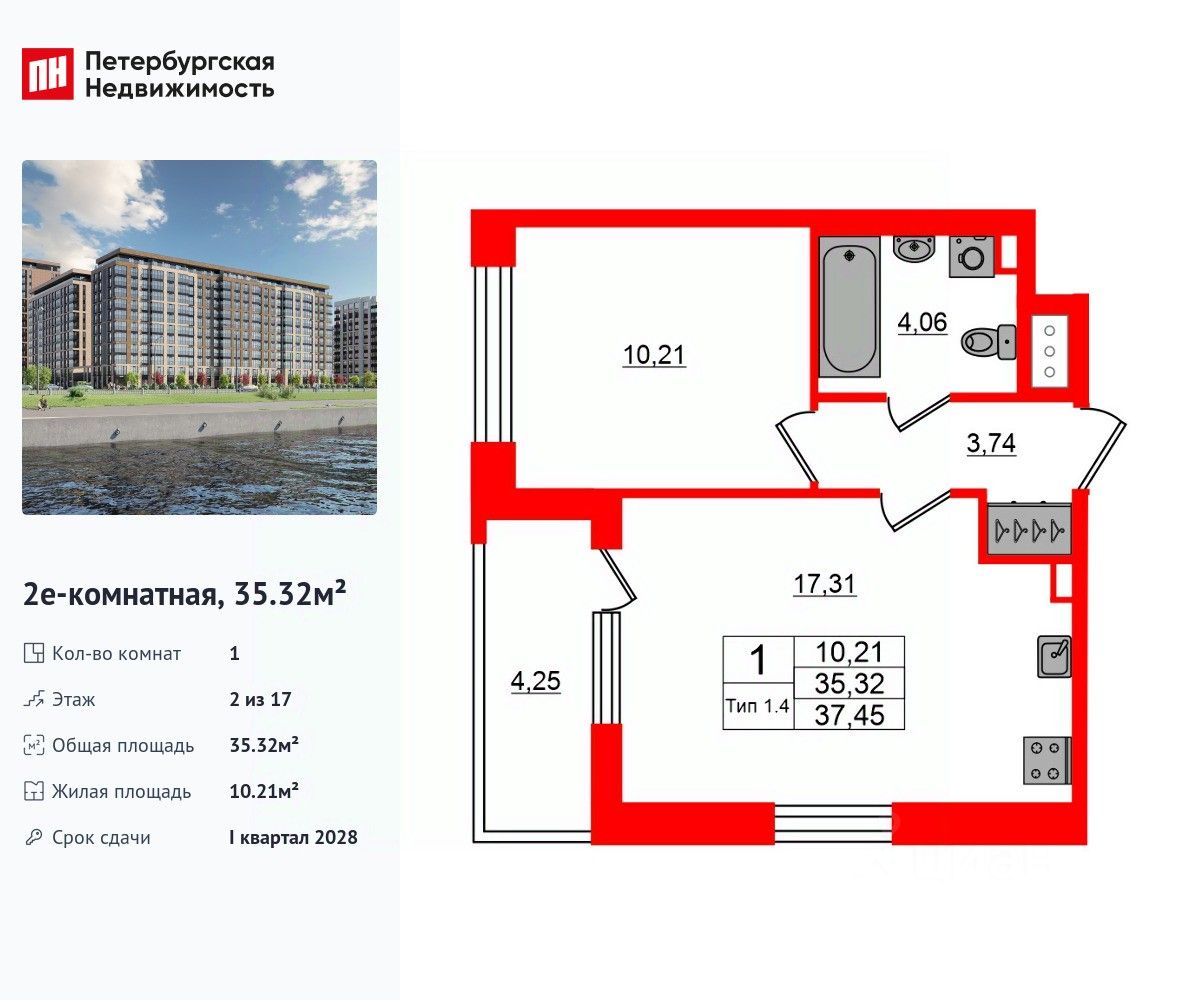 Удобная, классическая, функциональная европланировка, большая кухня-гостиная 17.31 м², вместительная прихожая 3.74 м². Общая площадь квартиры - 35.32 м², жилая 10.21 м², высота потолка 2.77 м.