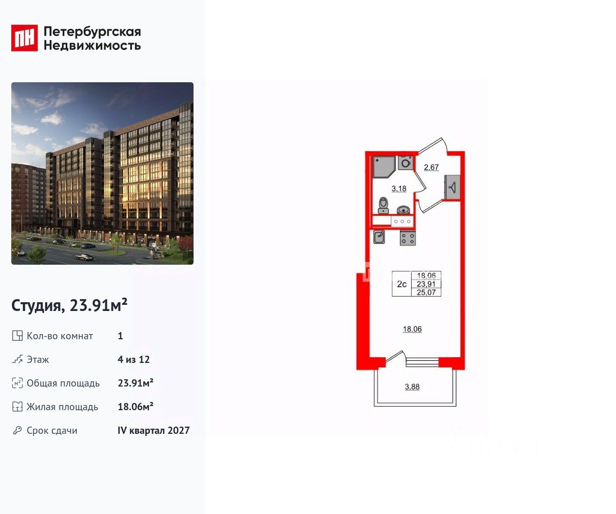 Удобная, классическая, функциональная европланировка, вместительная прихожая 2.67 м². Общая площадь студии - 23.91 м², жилая 18.06 м², высота потолка 2.75 м.