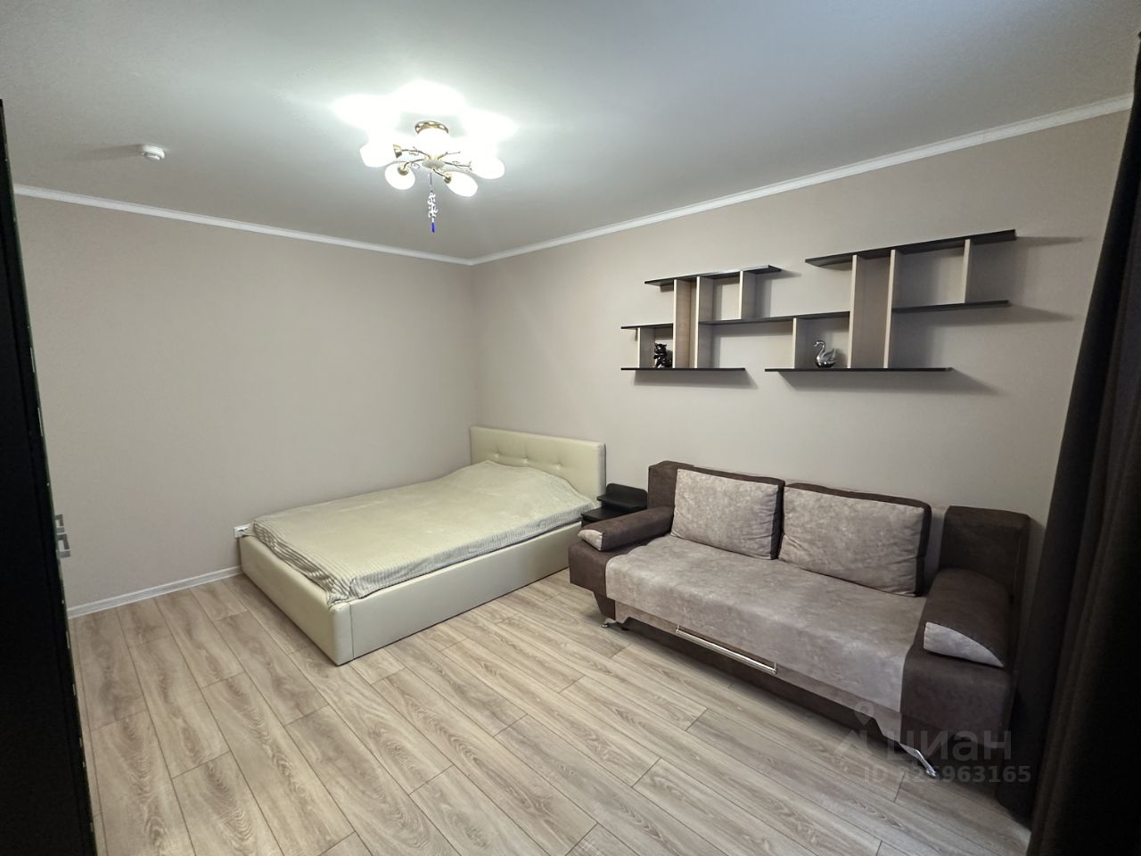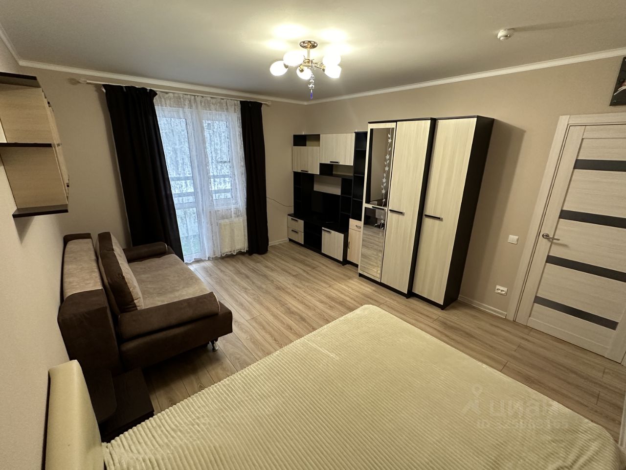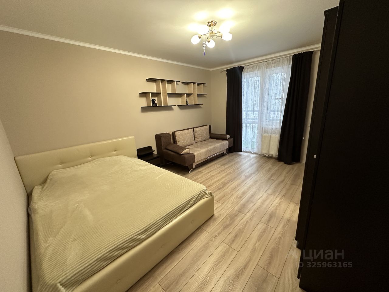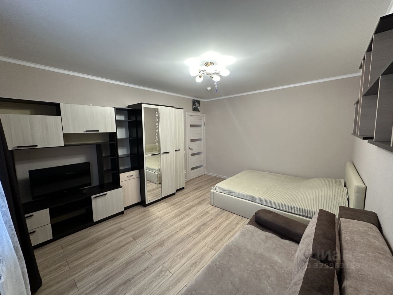 В гостиной кровать 160*200 с подъемным механизмом, раскладной диван, шкафы для хранения, телевизор.