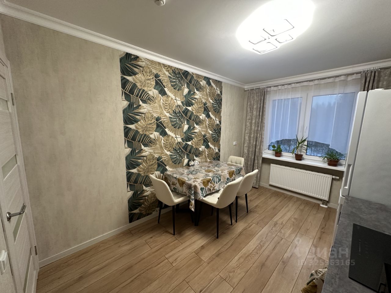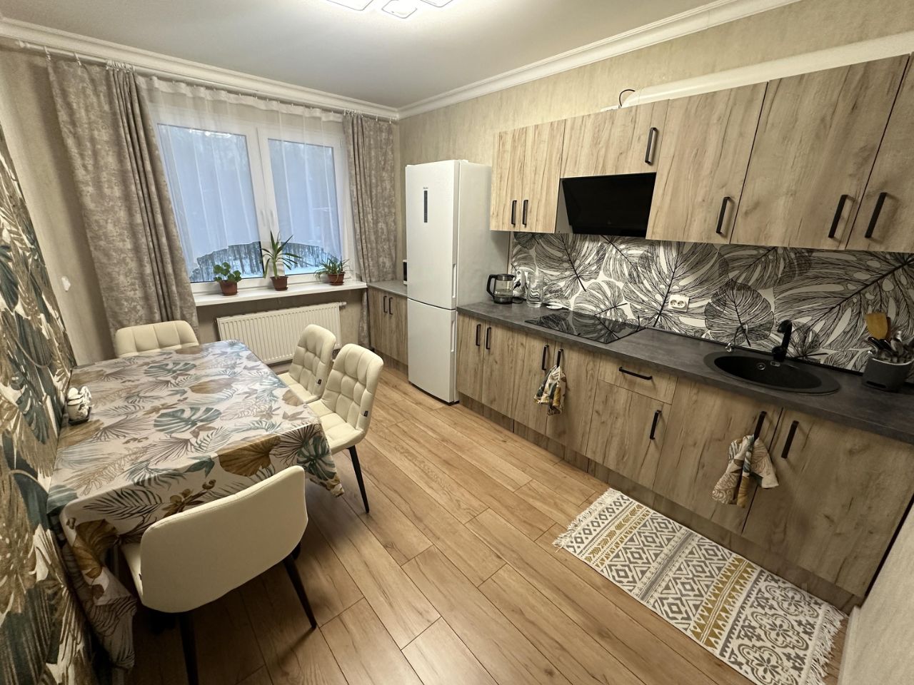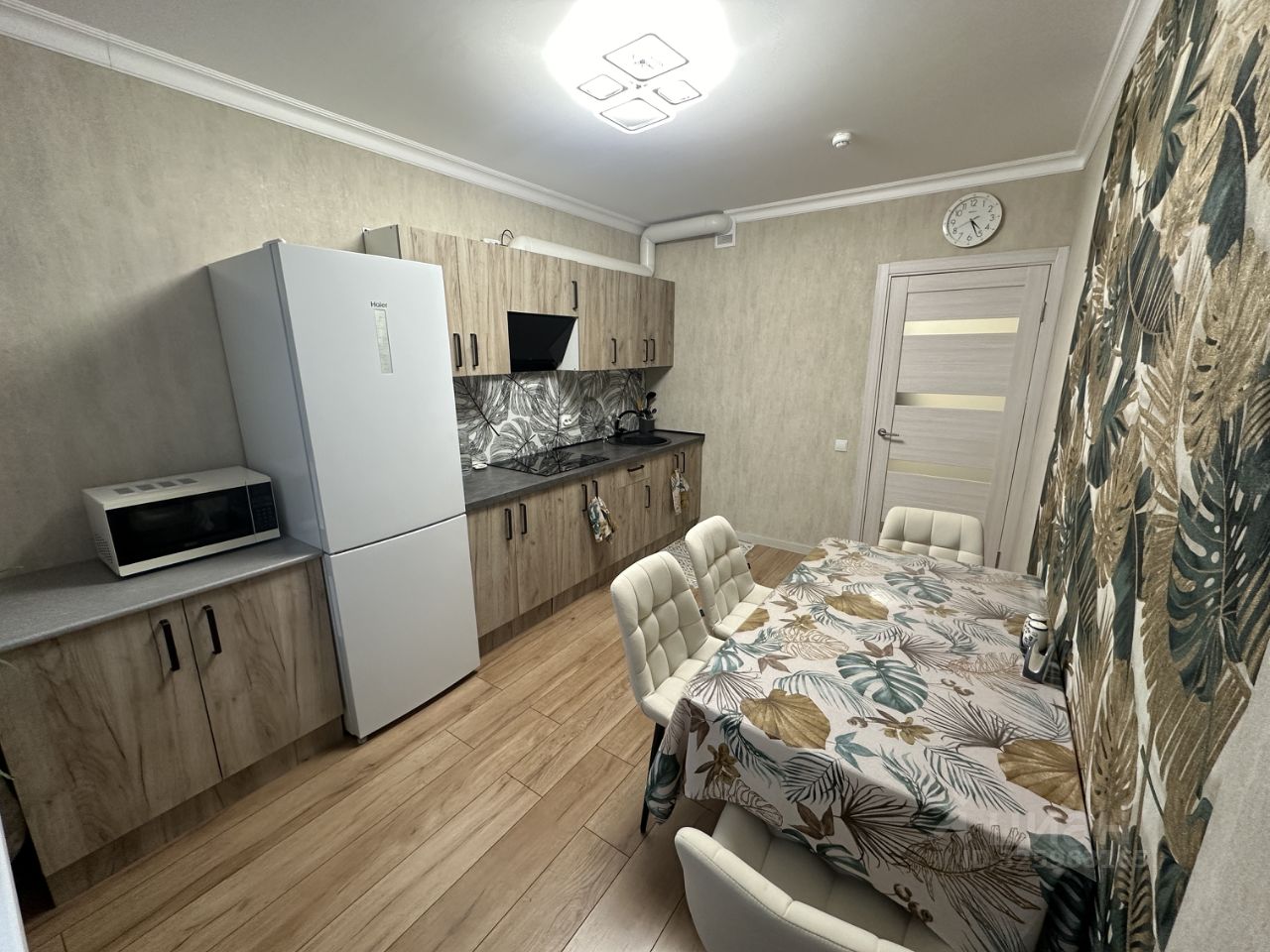 Просторная кухня 11,4 кв. м, есть холодильник, индукционная плита, вытяжка, микроволновка, электрический чайник.