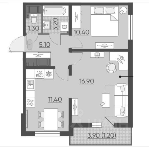 Санузел раздельный, оснащён ванной и стиральной машиной. Лоджия застеклённая, с выходом из гостиной.
