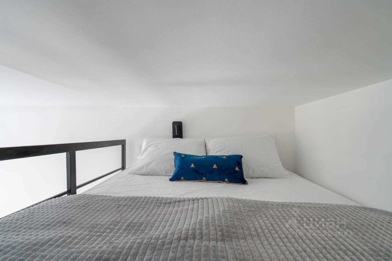 Площадь 14, 9 м2 , второй ярус - 6 м2, высокие потолки 3, 3 метра.