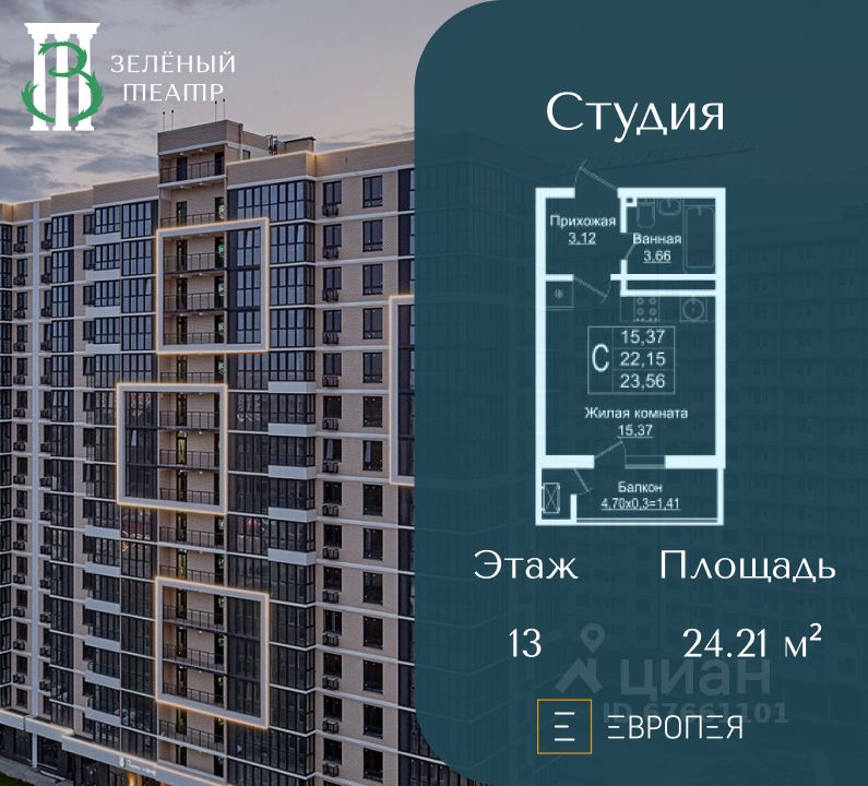 ''Зелёный театр'' — уникальный жилой комплекс нового формата, который превращает жизнь в настоящий курорт! Здесь гармонично сочетаются комфорт, яркая архитектура и парковая эстетика. Наслаждайтесь прогулками, отдыхом с детьми и занятиями спортом прямо во дворе — всё для вашего уюта и здоровья.