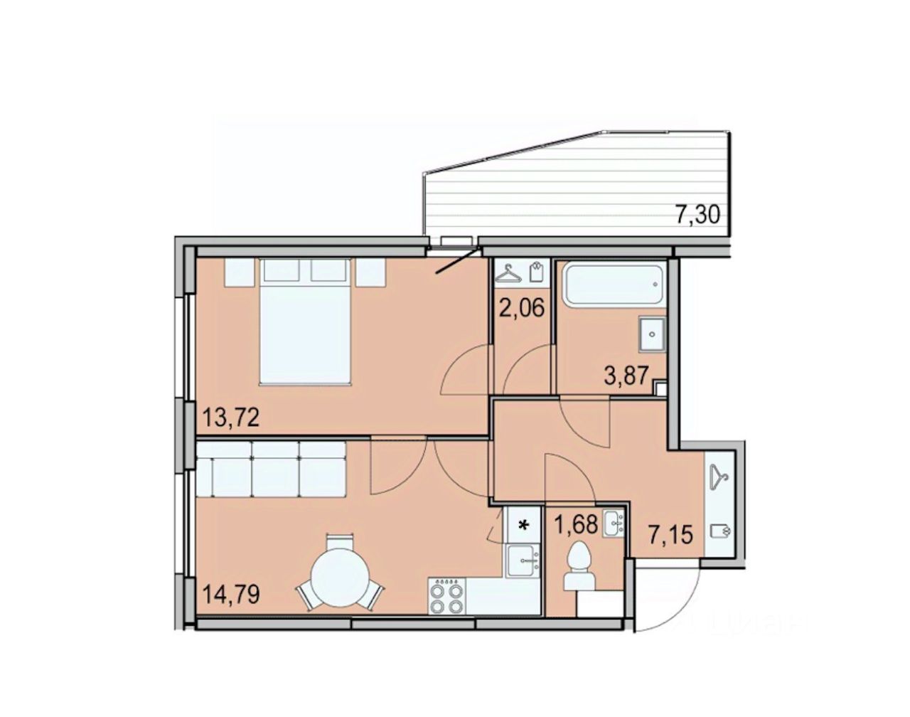 Общая площадь квартиры составляет 43,3 квадратных метра, кухня занимает 14,79 квадратных метров. Жилая площадь сформирована по евро-планировке, объединяющей кухню и гостиную, что создаёт просторное и светлое пространство. Высота потолков — 2,8 метра. Квартира расположена на 11 этаже 26-этажного монолитного дома, построенного в 2022 году. Санузел раздельный, оборудован тёплым полом, что повышает уровень комфорта. Из окон открывается вид во двор, имеется отдельный балкон удобной площади с видом на лесной массив.