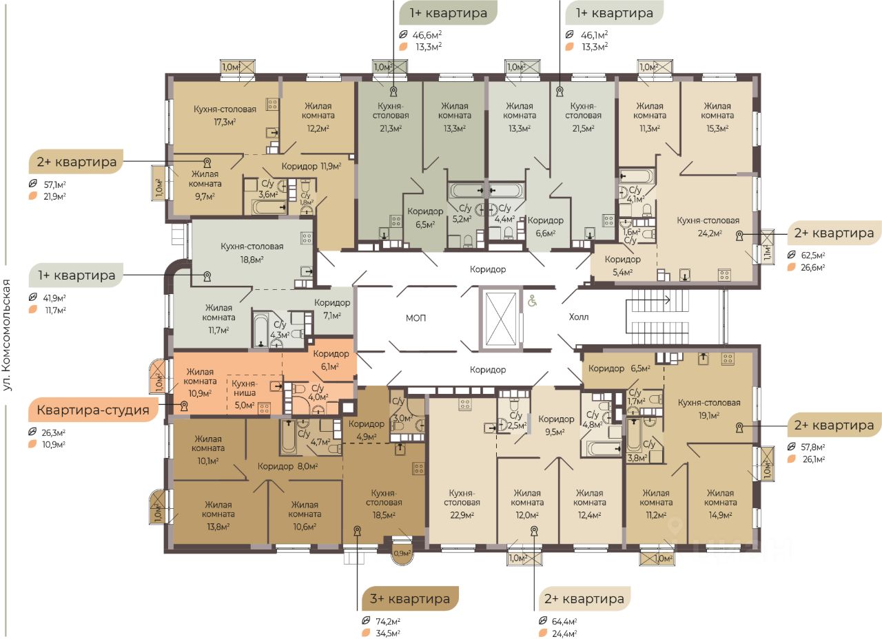 ''Трио'' — это новый жилой комплекс комфорт-класса, который расположится на Комсомольской улице в Автозаводском районе Нижнего Новгорода. ЖК ''Трио'' состоит из трёх ярких одноподъездных корпусов. Высота каждого корпуса не превышает 8 этажей. А это значит, что дом будет ''камерный'', с небольшим количеством соседей, которые станут настоящими друзьями. В ЖК ''Трио'' запроектировано 7 видов планировочных решений площадью от 24,8 кв.м. до 89 кв.м. Всего в комплексе будет 200 квартир. Важным преимуществом является наличие кладовых, которые будут располагаться на 1 этаже. Благоустроенный закрытый двор с площадками для детей разных возрастов, зонами отдыха для взрослых и придомовой территорией с озеленением — станет любимым местом для прогулок. Для комфортного проживания и безопасности будущих жильцов в комплексе запроектировано 146 машиномест на прилегающей территории, что реализует концепцию жилого комплекса ''Двор без машин''. Приобретая квартиру в ЖК ''Трио'', вы обретаете новое качество жизни в уже сформировавшейся инфраструктуре, где в пешей доступности располагаются детские сады и школы, поликлиники и ветеринарные клиники, супермаркеты и торговые центры, остановки общественного транспорта, парикмахерские и т.д. Срок сдачи дома - 4 кв. 2026 г. Цена указана с максимальной скидкой 10%. Цена действует при 100% оплате стоимости приобретаемого объекта или ипотеке. В зависимости от уровня первоначального взноса применяется скидка от 1-9% (при приобретении квартиры в рассрочку). Уточняйте подробные условия и наличие квартир в офисе продаж, записывайтесь на консультацию!