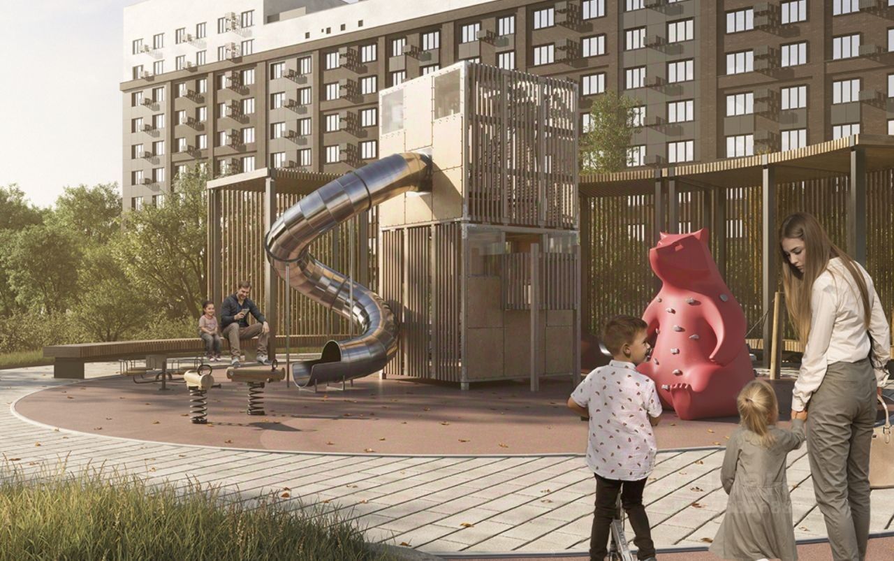 В квартале зелёные дворы без машин: здесь безопасно играть детям и комфортно отдыхать взрослым. Для автомобилей рядом с кварталом строится многоуровневый паркинг.
