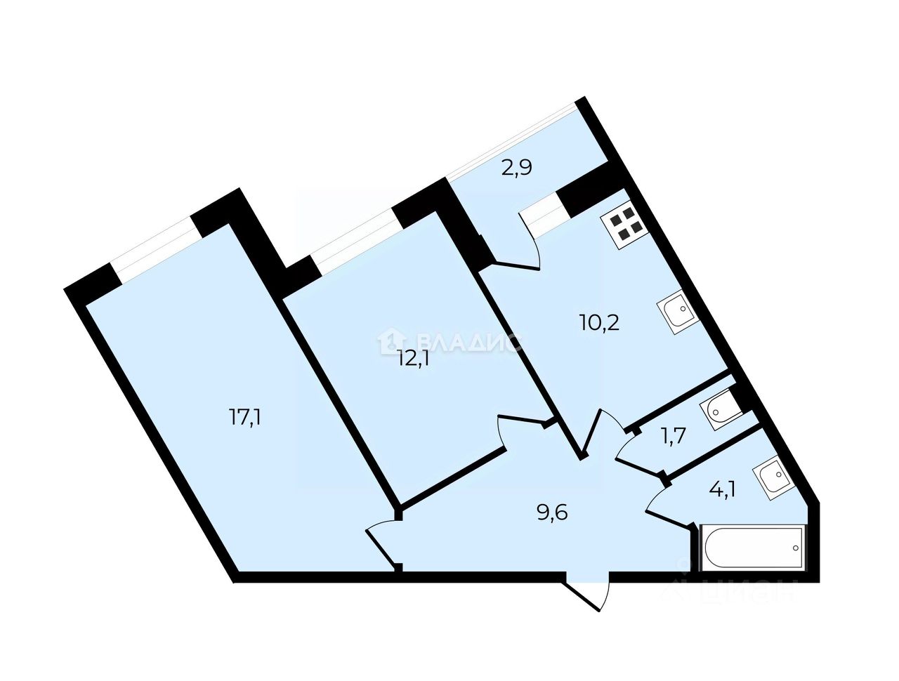 Удобная правильная планировка, общая площадь квартиры : 54,8 кв метра, две раздельные комнаты 17,1 и 12,1 кв метр. кухня 10,2 кв м с выходом на большую застекленную лоджию. Коридор 9,6 кв, в котором можно разместить отличные места хранения.