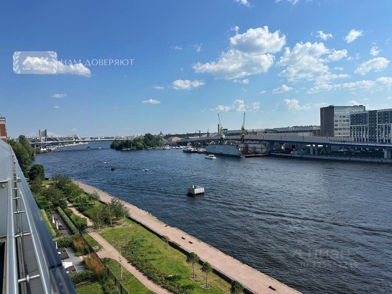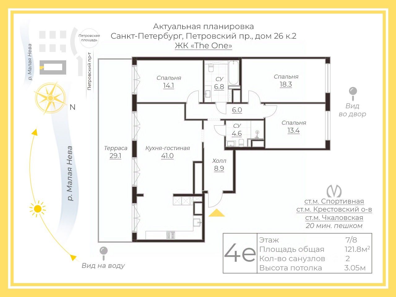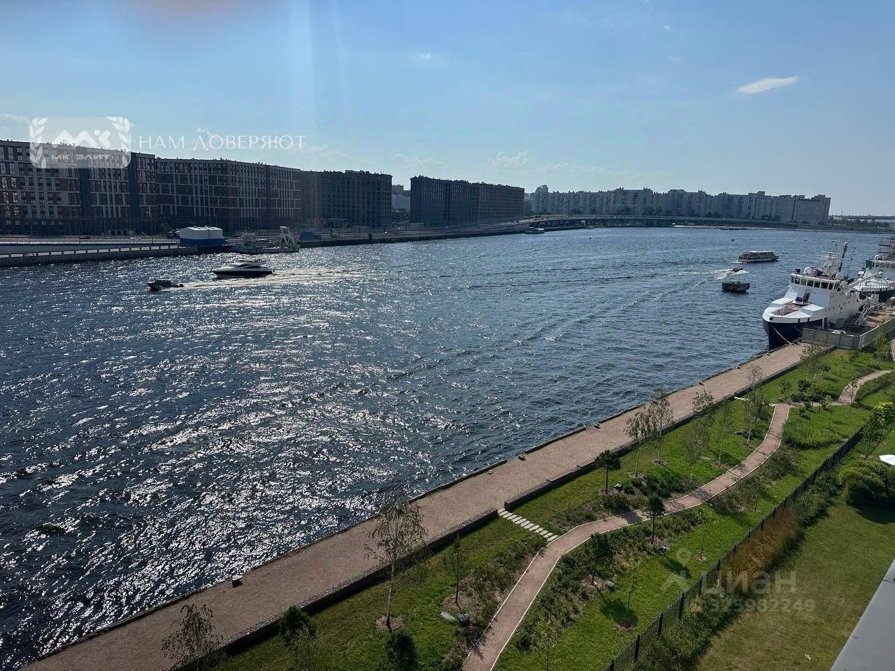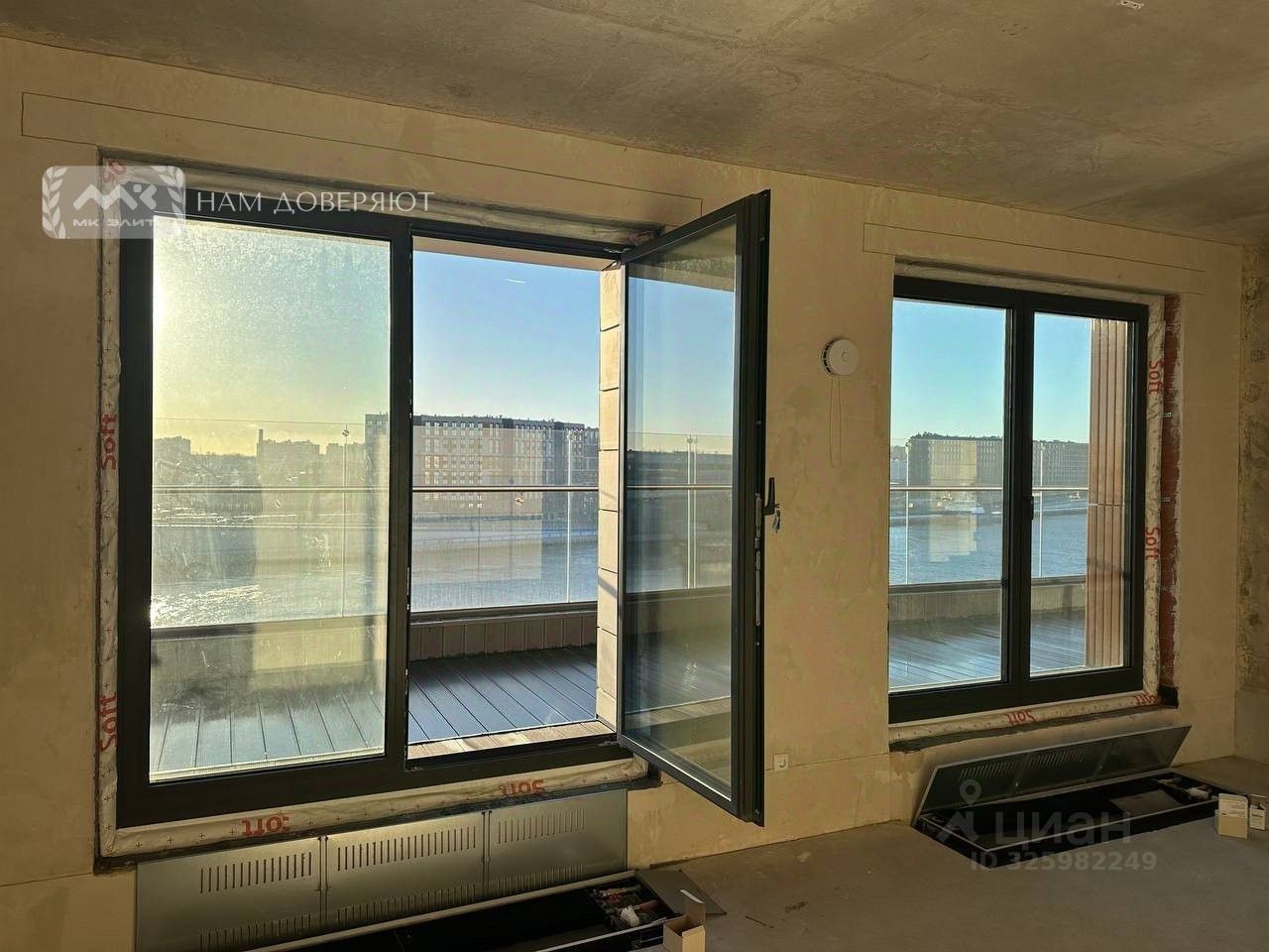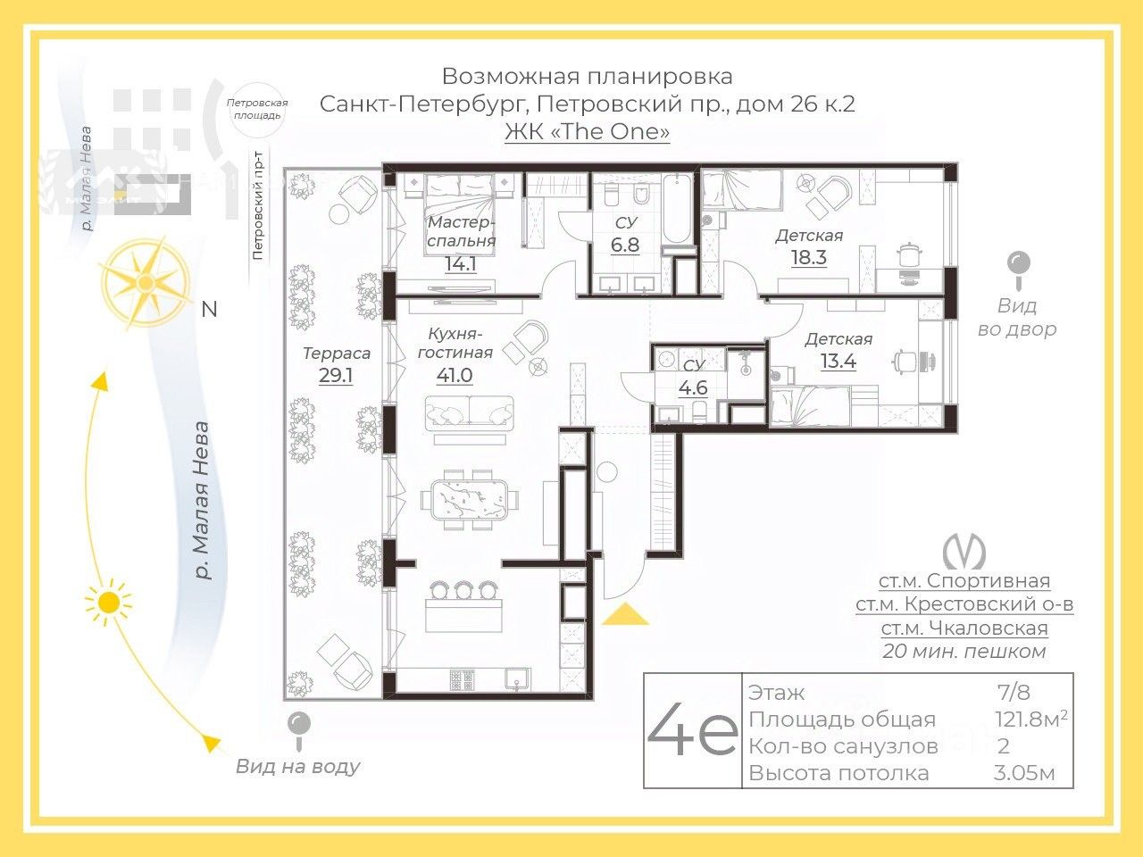 Со стороны террасы квартира выходит на юг, квартира буквально залита солнцем. Панорамные окна в пол предусмотрены только на последних этажах. Здесь открывается красивая панорама воды от Исаакиевского Собора и вплоть до выхода в Финский Залив.