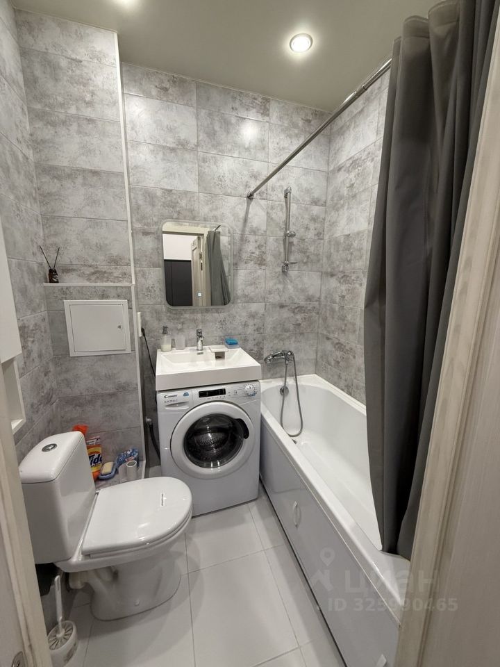 Кухня оборудована всем необходимым: встроенная техника, обеденный стол и современный гарнитур. Жилая зона оформлена в светлых тонах, создавая ощущение простора и комфорта. В санузле установлена современная сантехника и стиральная машина.