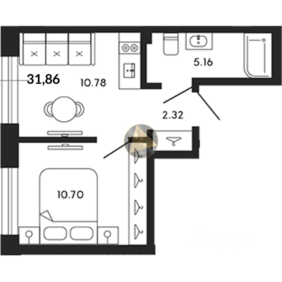 Квартира находится на 4/8 этаже. Общая площадь квартиры 31,86 м2. Светлая спальня 10,70 м2. Кухня 10,78 м2 Совмещённый санузел 5,16 м2.
