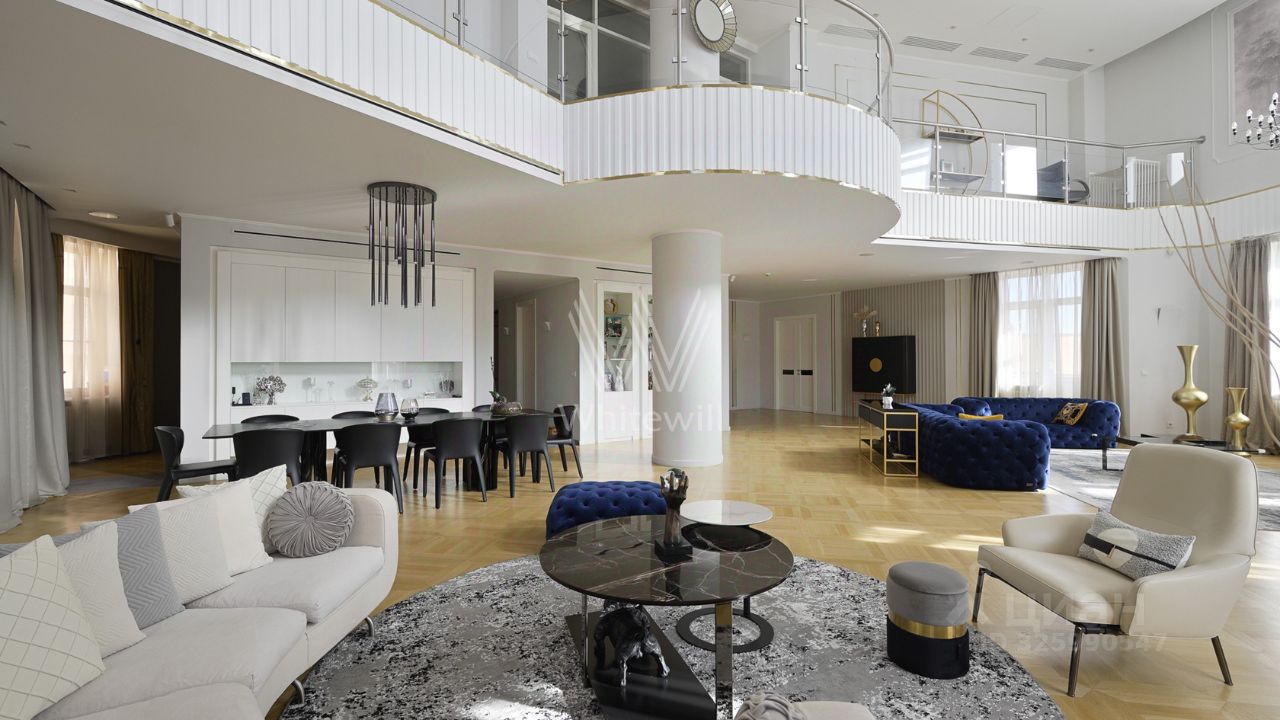 Срочная продажа. Двухуровневый пентхаус площадью 505 м² с террасой в комплексе бизнес-класса ''Каскад'' на набережной реки Яузы. Пентхаус с отделкой в неоклассическом стиле расположен на восьмом и девятом этажах. Интерьеры выполнены в светлых лаконичных тонах и украшены декоративными молдингами, лепными деталями и графикой на стенах. В оформлении использованы фактуры мрамора и дерева. Квартира полностью меблирована и укомплектована бытовой техникой премиальных производителей Kuppersbusch, Liebherr, ASKO.