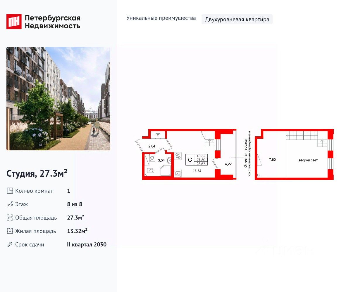 Уникальная, функциональная европланировка, вместительная прихожая 2.64 м². Общая площадь студии - 27.3 м², жилая 13.32 м².