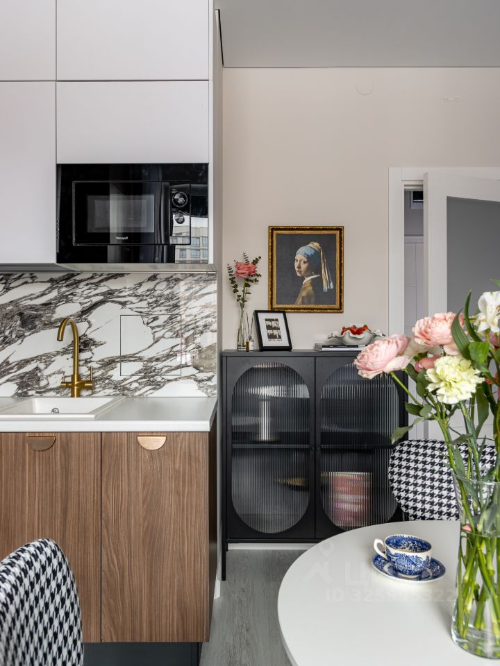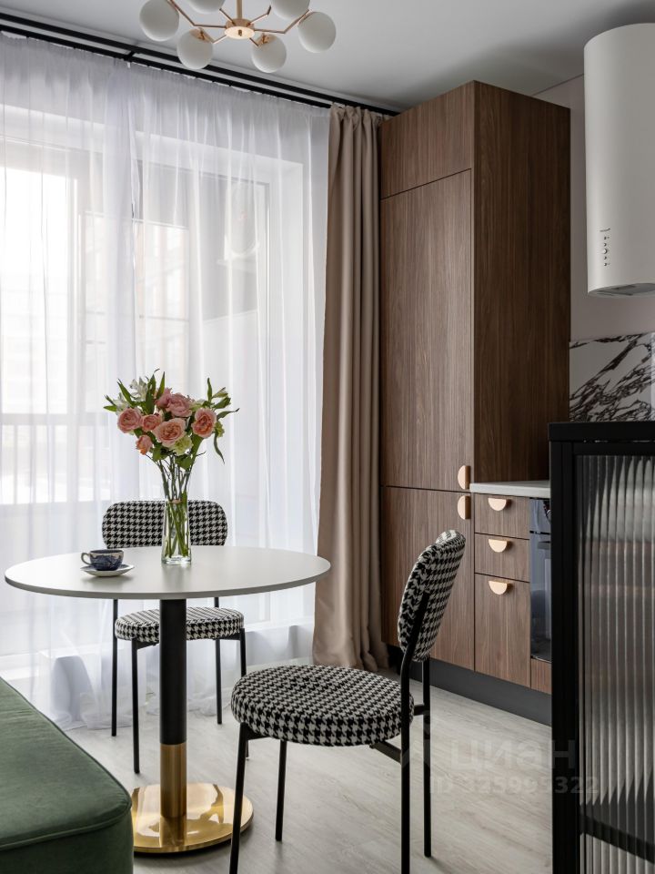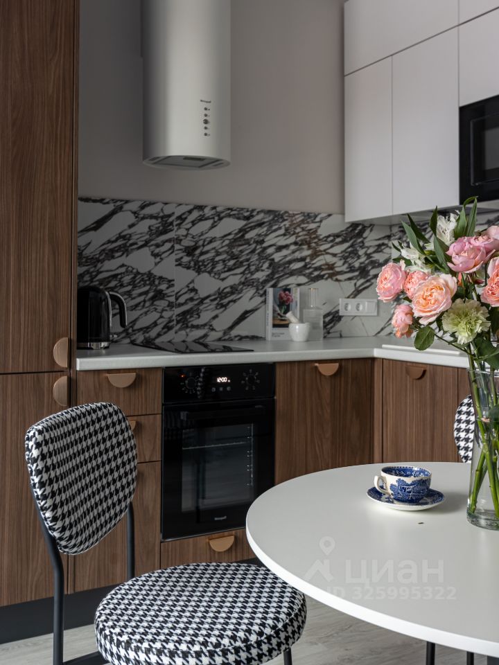 Кухня: обеденная зона на 3-4 человек, комфортная кушетка для приятного отдыха, отдельно стоящая витрина как дополнительное место для хранения, кухонный гарнитур с необходимой техникой: плита на 2 конфорки, вытяжка, духовой шкаф, посудомоечная машина, встроенный холодильник, СВЧ, фильтры для воды. Различные варианты освещения: верхний свет и бра.