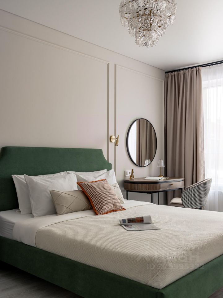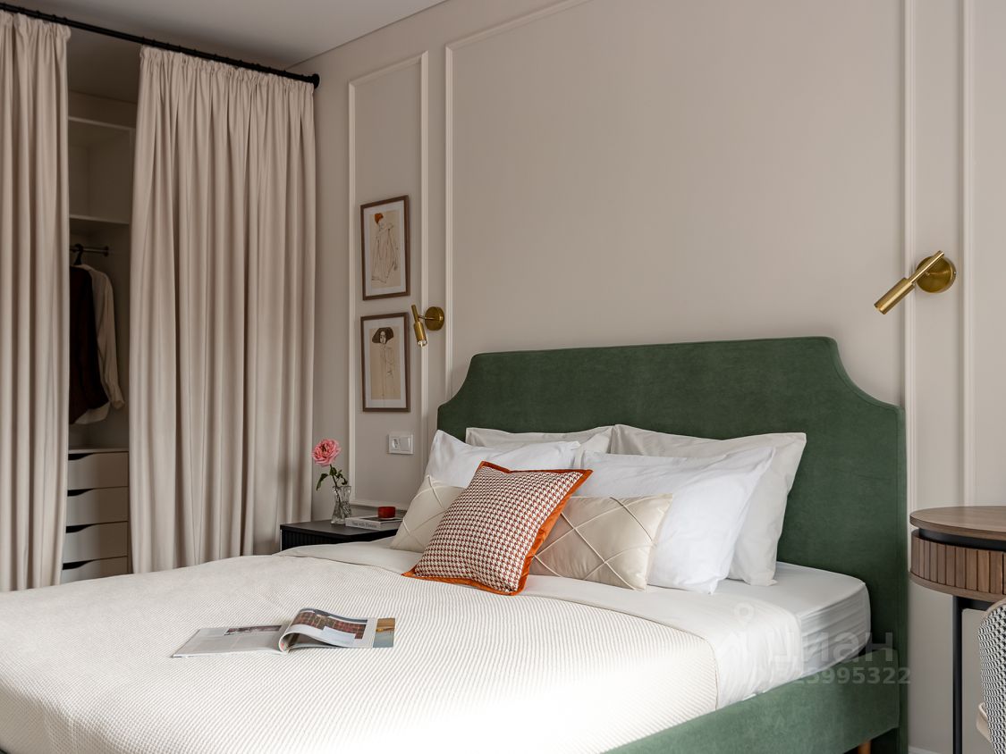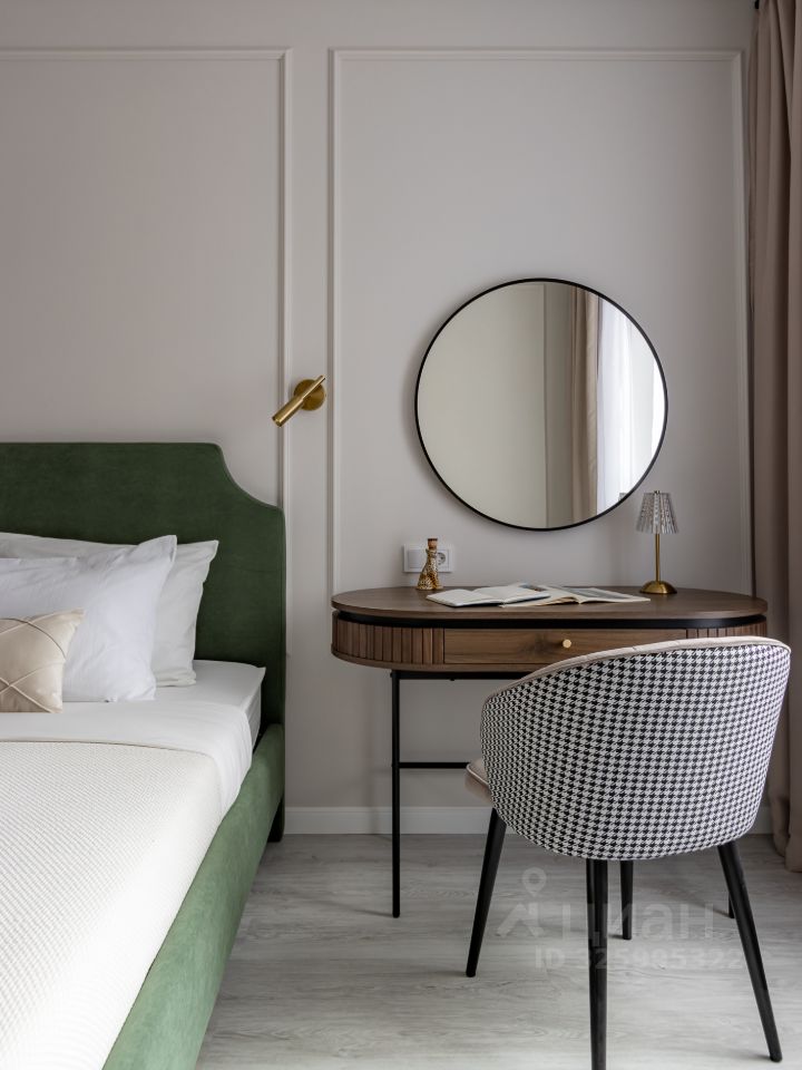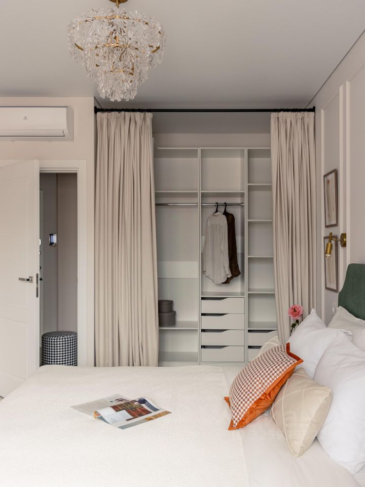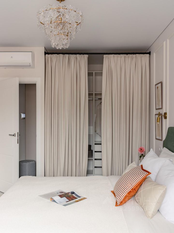 Спальня: кровать с ортопедическим матросом 180 см, рабочий стол с креслом, телевизор, кондиционер, вместительная гардеробная, шторы блэкаут для комфортного сна.