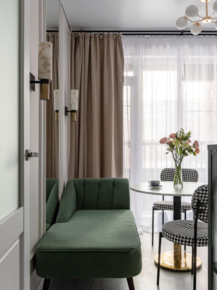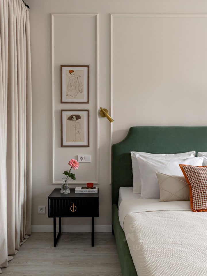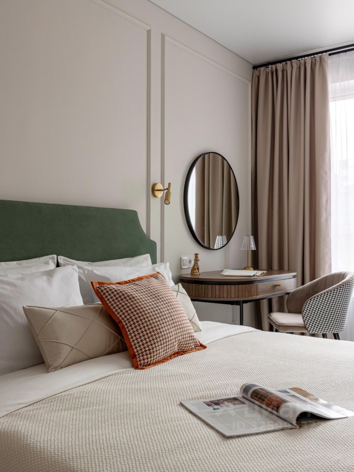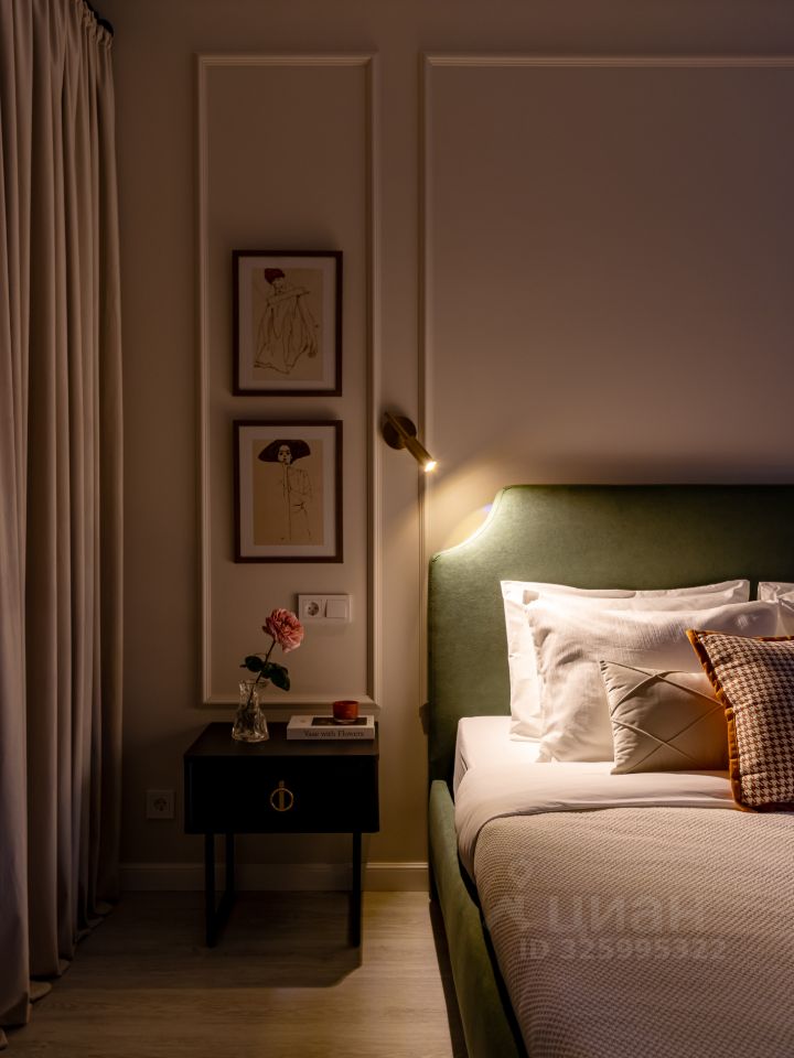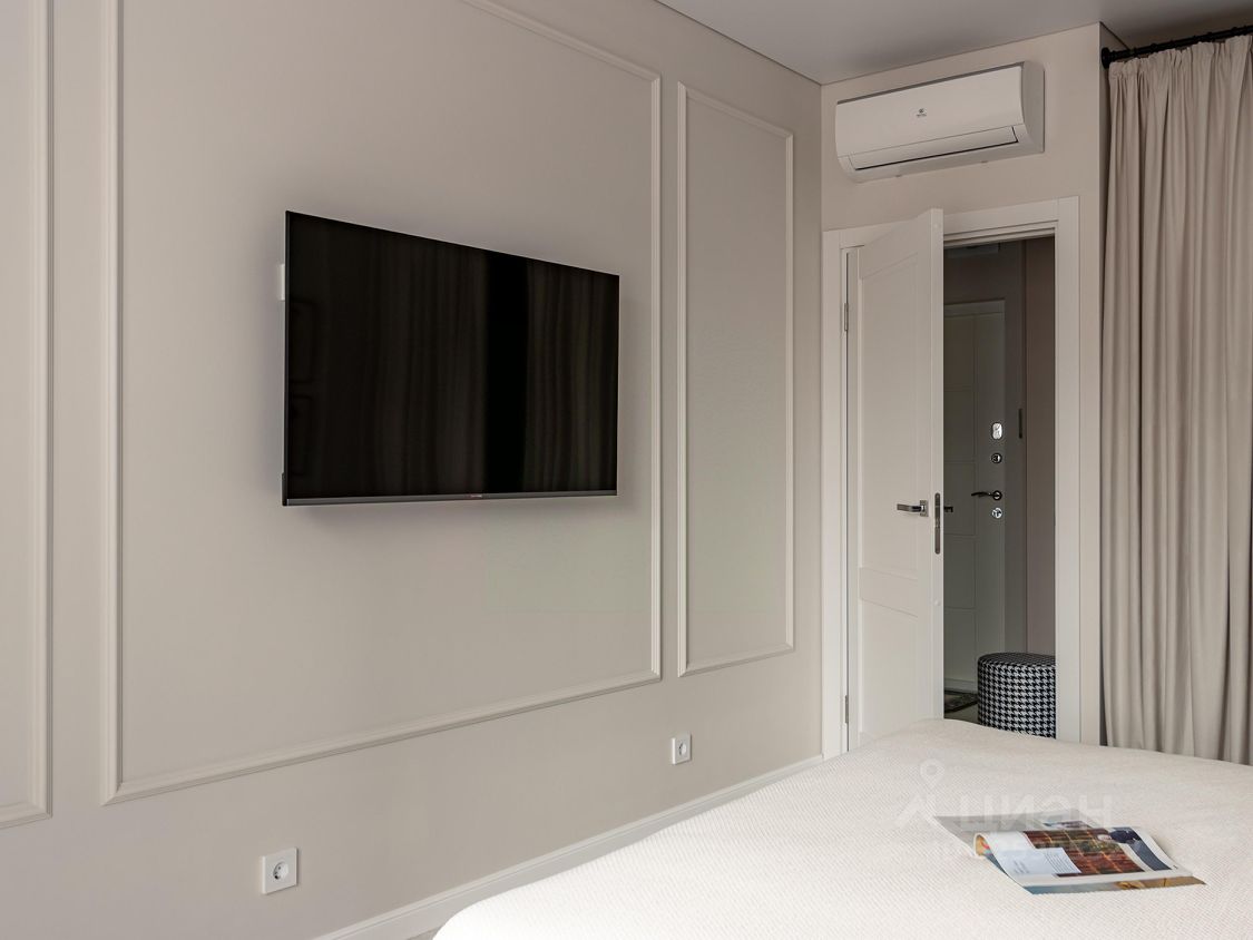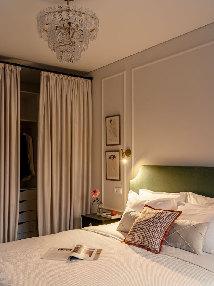 Спальня: кровать с ортопедическим матросом 180 см, рабочий стол с креслом, телевизор, кондиционер, вместительная гардеробная, шторы блэкаут для комфортного сна.