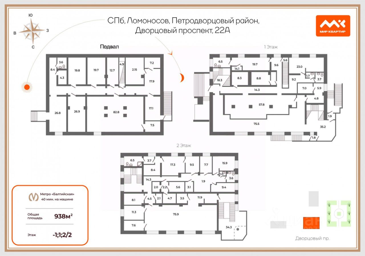 Общая площадь: 938,2 м2 3 этажа, в том числе подземных 1 Высота потолка: 3,5 м Витринные окна Отдельный вход: 5 входов Электричество: 145 кВт Все городские коммуникации Земельный участок в собственности