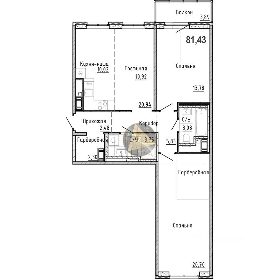 О квартире: - Квартира находится на 3 этаже 7-этажного дома - Общая площадь квартиры 81.43 м2 - Светлая спальня 20.70 м2 с гардеробной - Уютная детская 13.78 м2 - Просторная кухня-гостиная 20.94 м2 - Гардеробная 2.30 м2 - 2 совмещённых санузла 3.75 и 3.08 м2 - Застекленный балкон 3.89 м2