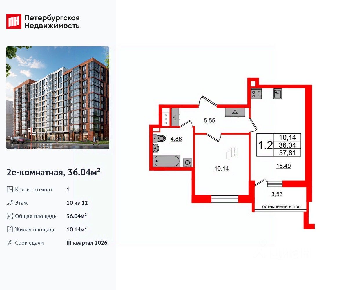 Удобная, классическая, функциональная европланировка, большая кухня-гостиная 15.49 м², просторная прихожая 5.55 м². Общая площадь квартиры - 36.04 м², жилая 10.14 м², высота потолка 2.77 м.