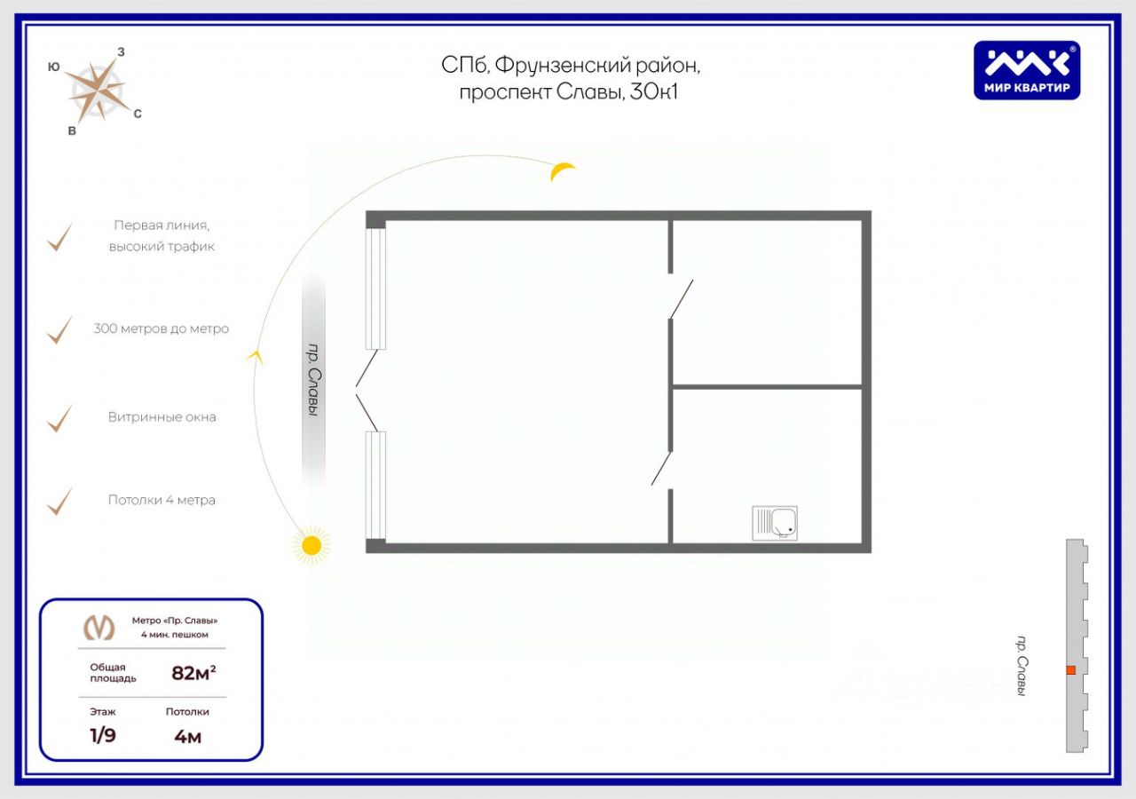 Арт. 102881141 Аренда без комиссии! В аренду предлагается часть помещения с витринными окнами в 300 метрах от станции метро ''Проспект Славы''!